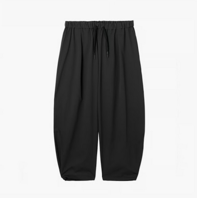 外側に膨らみを持たせ、内股をすっきりと設計することで独特な丸みを表現したワイドカーブパンツ。 素材には、多機能かつ高品質な「SPORTEX」を採用。 2WAYストレッチ、防シワ、接触冷感、UVカット、透湿撥水、ウォッシャブル性を兼ね備え、年々暑さを増す夏にも、その機能性を存分に発揮します。 セラミック粒子を練り込んだフルダル糸によるドライな肌触りと、光を吸い込むようなマットな 質感、そして上品な落ち感が、モダンで洗練された佇まいを演出します。 フロントには深めのワンタックを入れ、立体的な表情をプラス。 裾にはスピンドルを配しており、シルエットの調整が可能です。 さらに、内股の縫い目はインサイドアウトで仕上げ、縫いどめの透明なテープをはわせることで、さりげないアクセントを添えています。 POLYESTER 85% POLYURETHANE 15% SIZE.1 ウエスト (Waist) 80cm / 股上 (Rise) 30cm / 股下 (Inseam) 68cm / 裾幅 (Hem width) 20cm SIZE.2 ウエスト (Waist) 86cm / 股上 (Rise) 31cm / 股下 (Inseam) 70cm / 裾幅 (Hem width) 21cm 着用モデルBLACK:180cm / SIZE.1