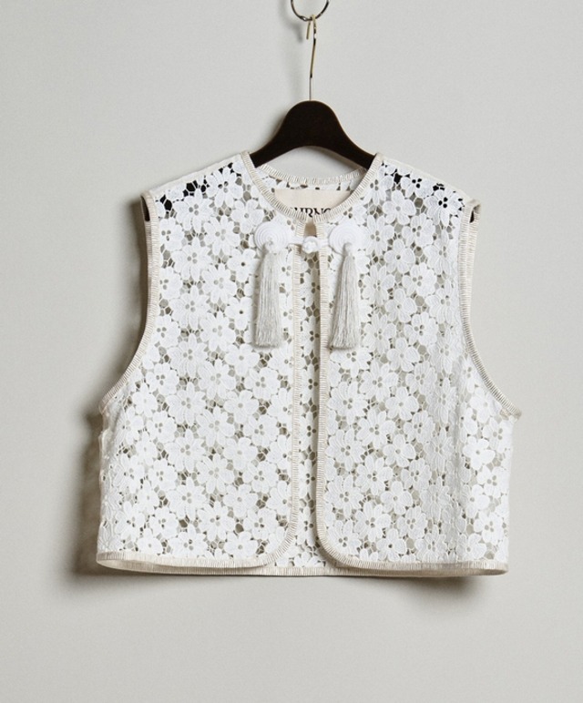 - TOURNON - TOURNON.(トゥルノン)は、パリ6区・サンジェルマン・デ・プレから リュクサンブール公園へとまっすぐに伸びる「rue de Tournon」に由来するレディースブランドです。 通りの名に込めたのは、何気ない日常のなかにある、軽やかで、少しだけ特別な時間。 澄んだ空気を吸いながら歩く、パリの日常。 トラッドを軸に、ヴィンテージや異国の記憶をまとうようなディテールを重ねて、 “凛として、明るく、自然体に滲む女性らしさ” を感じさせる、新しい日常着を提案します。 国内の老舗のレース工場にてオリジナルで作成したコットンのケミカルレース素材 ノスタルジックなフラワーモチーフ ・エレガント過ぎずカジュアルに着られるレースベスト ・カットソーやドレス、オーバーオールなどに重ねることで着こなしに抑揚を ・別注の異国情緒漂うオリジナルボタン ・太畝のグログランパイピング使い 素材 : Face: COTTON/100% Base: POLYESTER/100% SIZE FREE : 着丈46.5 身幅54 肩幅41 (cm) *計測サイズはあくまで参考の数字です。測り方に寄りましては多少の違いが出ますのでご了承下さい。