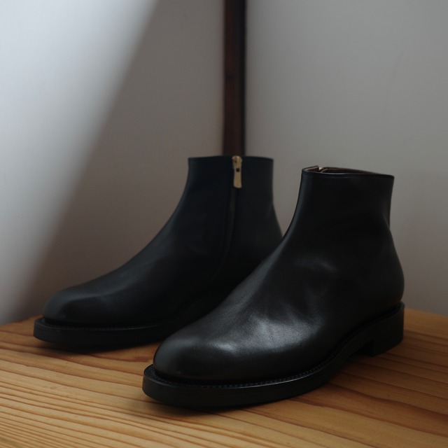 足部の石膏像から着想を得て、「履いていった先に足の抜け殻のようになる靴」をイメージして作られた、formeを代表する一足 “Molder(モルダー)”。 ミニマルな造形美と、日常の道具としての実用性が高い次元で融合した、ブランドの哲学を象徴するサイドジップブーツです。 1. 繊細さと力強さを併せ持つ「イタリアンカーフ」 アッパーには、きめ細やかで上品な光沢を放つ最高級のカーフレザーを使用しています。 • 上質な肌目: 子牛革ならではの柔らかさと、足に吸い付くようなしっとりとした質感が特徴です。 • 美しい経年変化: 履き込むほどに深い艶が増し、独自のシワが刻まれることで、数年後には文字通り「自分の足の形」を写し取った唯一無二の風合いへと育ちます。 2. 究極のミニマリズムを追求した「接ぎ」のない設計 Molderの最大の特徴は、通常サイドジップの外側に入る「接ぎ(はぎ目)」を一切無くしている点にあります。 • 流麗なライン: かかと部分以外に継ぎ目がない一枚革に近い構成が、カーフの滑らかな曲線を際立たせます。 • No.10ラスト: つま先のボリュームを抑え、シャープにシェイプさせた木型を採用。足首から甲にかけてのラインが、装いに知的な色気を与えます。 3. Soletech社と作り上げた、理想の「歩行」を支えるソール アウトソールには、信頼の厚いSoletech(ソールテック)社の素材を採用しています。 • 機能と美の両立: レザーソールの美しさを維持しつつ、高いグリップ力と耐摩耗性を備えています。悪天候でも気兼ねなく履ける実用性は、現代の道具として不可欠な要素です。 • 快適な履き心地: 屈曲性に優れ、長時間の歩行でも疲れにくい設計。職人による堅牢な作りと相まって、10年、20年と長く寄り添える「歩くための道具」としての完成度を支えています。 model:ff-115 last:no.10 material:Calf color:black method:goodyear welted / Soletech