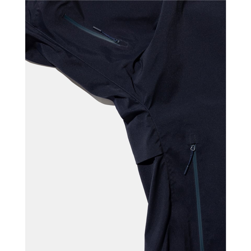 ストレッチ性に飛んだ「WINDSTOPPER® BY GORE-TEX LABS ソフトシェル」採用のスタンドカラーブルゾン。高い防風性と優れた透湿性で、さまざまなシーンで活躍する汎用性の高い一枚です。肩から腕にかけてアーチをかけて繋がる特徴的なパターンを採用し、フィッシングで動きやすい設計にこだわりました。ブランドのアイコンでもある、極細のコンシールファスナーを表裏で8つ配し、様々な用途に使用可能。フロント左胸に配した大きなポケットは、ルアーケースやキャンプギアや地図などの嵩張るサイズの収納に最適です。また、利き手を問わず使用できる左右対称に配したアームポケットは、フィッシングパスやICカード等の小物の収納を目的に設計しました。脇下には、熱や湿度をコントロールするためのベンチレーションを配し、衣服内の通気性を高めています。