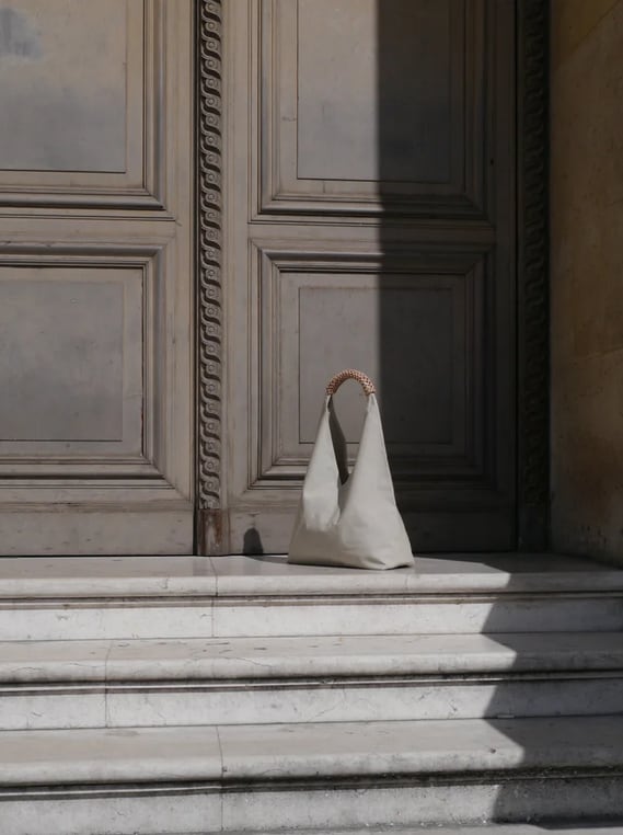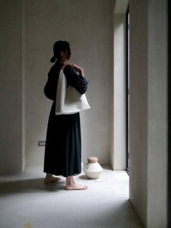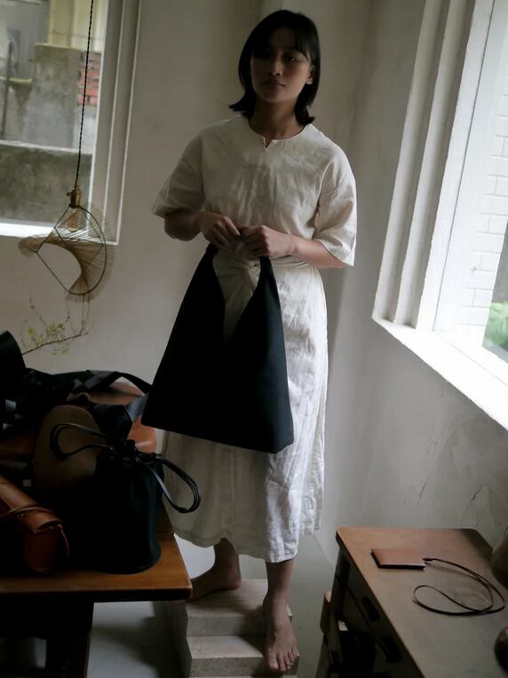 植物タンニンなめしの革ロープを用いた編み込みの三角バッグは、アミ族のオタル籐編みの技法(一本のロープで編む)を受け継いでいます。この三角バッグは、日本統治時代に東日本で流行した頑丈な米袋の構造にインスピレーションを得ており、日本のアズマ袋に由来しています。