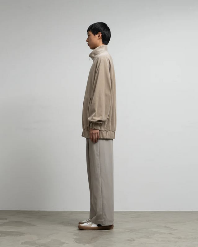クラシックなトラックジャケットをボリュームのある身幅と抑制の効いた襟元・袖口・裾のディテールでモダナイズ。カジュアルに見えがちなベロアを、高密度ハイゲージで編み立てることで度目を詰め、ナチュラルで上品な光沢感とダレにくさを両立。オーガニックコットンを使用し、コンパクト糸によって毛羽を抑えたシャープな表情に。
