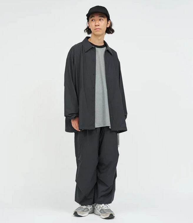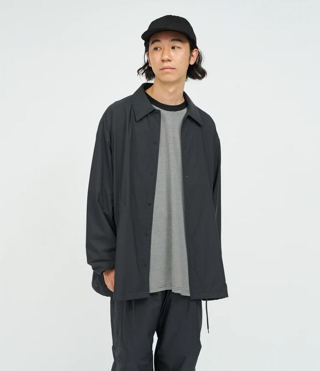 軽量で速乾性に優れた PERTEX® EQUILIBRIUM を使用したコーチジャケット。裏面で汗を素早く吸収し表面で発散することで衣服内を快適に保ち、ストレッチ性とメッシュ裏地の組み合わせによって動きやすくドライな着心地を提供します。スナップボタンの前立てやハンドポケット、裾のドローコードといったディテールが、シンプルなデザインに機能性をプラス。リラックスしたシルエットで、アクティブシーンから日常まで幅広く馴染みます。同素材のイージーカーゴパンツとセットアップで着用できるのも魅力。カラーは深みのある黒にグレーを含ませたチャコールブラック、グレーを帯びた落ち着いたニュアンスのカーキ、鉄のようなクールさを漂わせるスチールブルーを展開。いずれも一般的な色味とは一線を画す独自のトーンで、シンプルなスタイリングに奥行きを与えてくれます。
