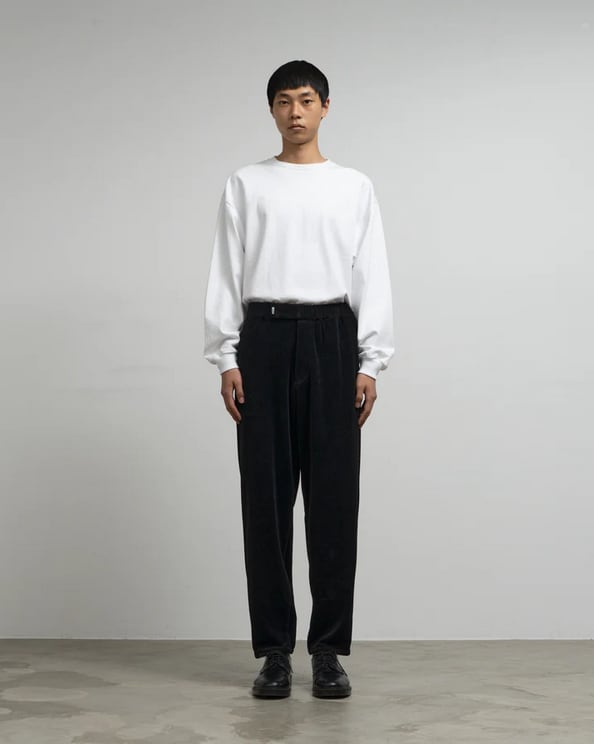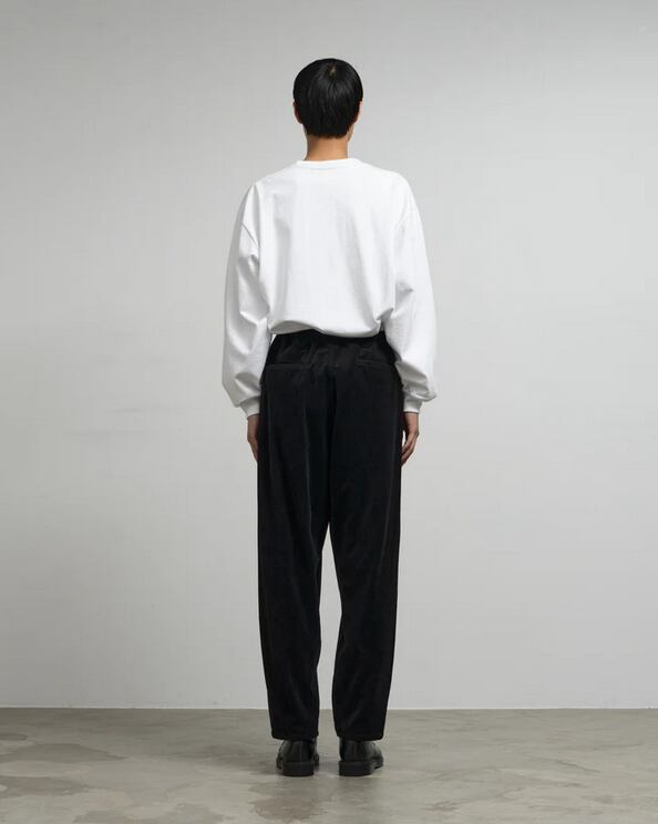 フランスのシェフパンツをべースにしたGraphpaper定番の裾幅を広げたワイドテーパードパンツ。ウエストのサイズを簡単に調整できてシルエットもアレンジ可能です。ベロア編み機で仕立てた、滑らかで立体感のある新仕様のニットコーデュロイを使用。優れたキックバックで型崩れしにくく、快適なストレッチ性も魅力の動きやすさと上品さを兼ね備えた一本。