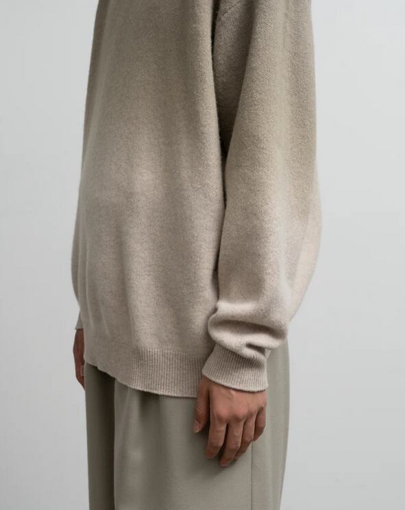 上質で膨らみのある紡毛糸を使用し、締まりとふっくら感を絶妙に両立させた特殊な編み組織で編み上げたミドルゲージのクルーネックニット。コレクションのカラーパレットを反映し、段階的に淡く移り変わるグラデーションが印象的なデザイン。柔らかな風合いと洗練された色彩が、冬の装いに豊かな表情を加える一着。