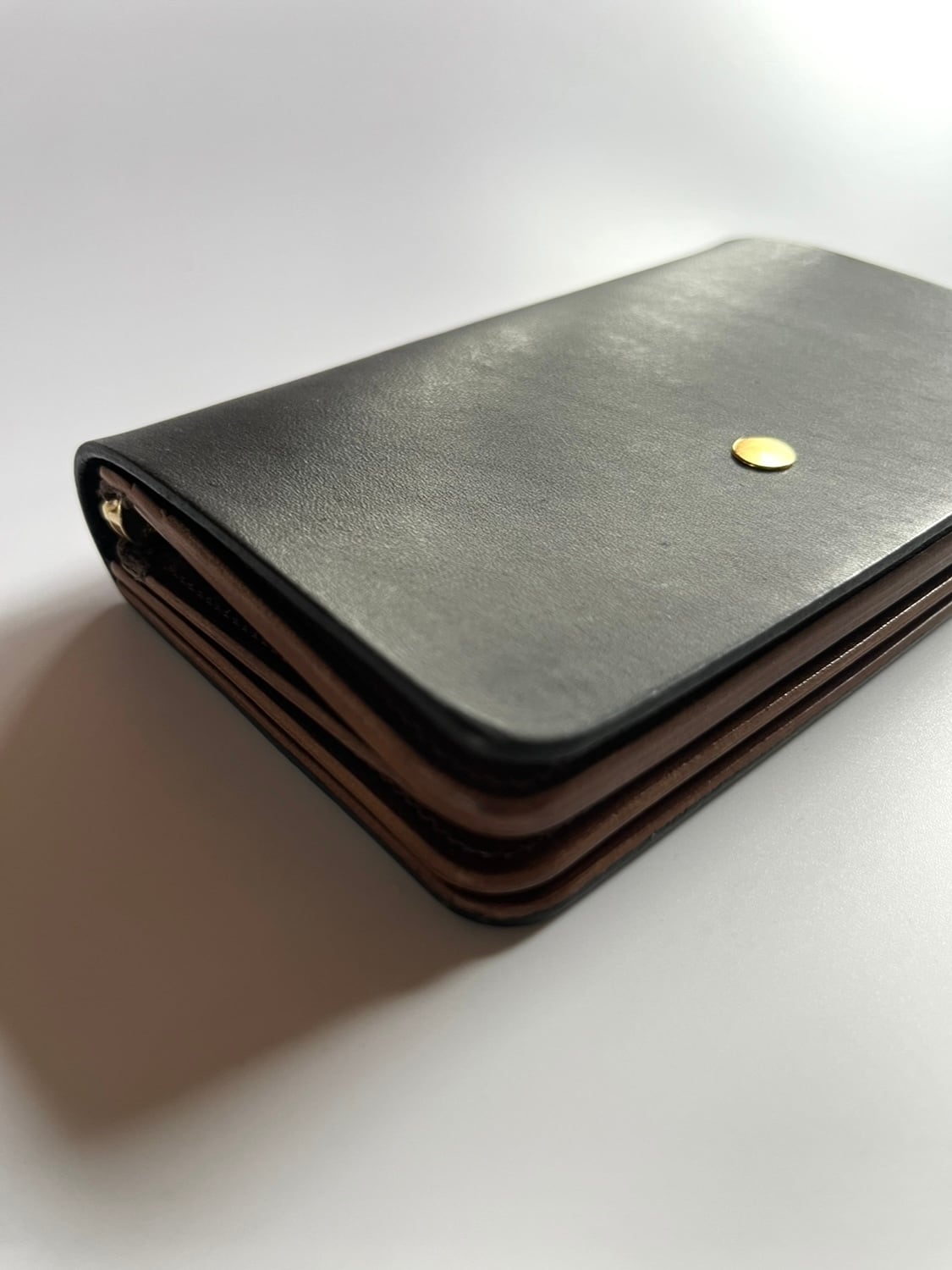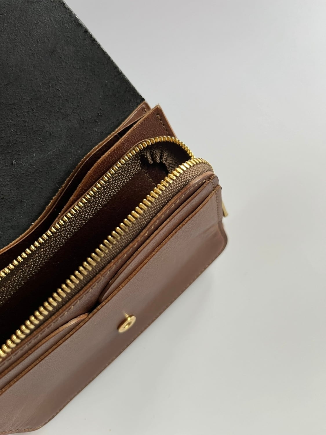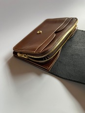 ポストウォレットやショートウォレットよりもひと回り大きく、お札は折りたたんで収納し、コイン収納はジップ式になります。