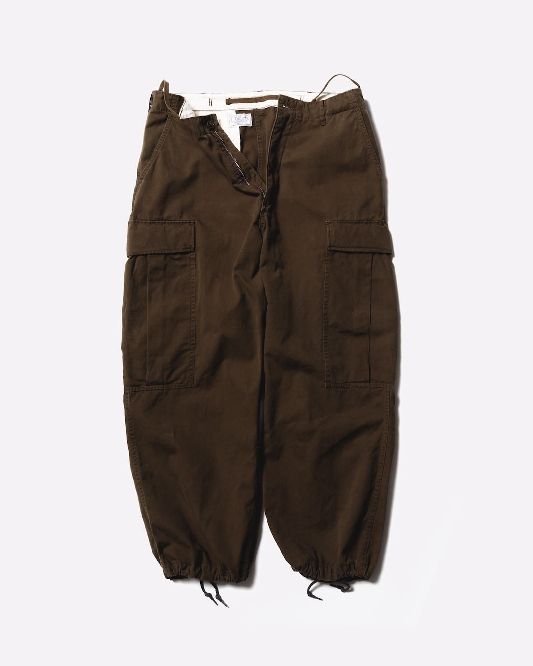 アメリカ軍のM-65型とベトナム6Pフィールドパンツのディテールを組み合わせた、Unlikely らしいミリタリーパンツ。 すっきりとしたフロントデザインながら、バックのフラップポケット、サスペンダー用ストラップ、サイドアジャスター、裾のドロー コードなど、ミリタリーパンツらしいワイルドで力強いディテールはそのままにデザインいたしました。最大の特徴は、名前の通り大 きく誇張されたサイドポケット "Magazine Side Pocket"。雑誌1冊がすっぽり収まるほどの大きさで、雑誌の "Magazine" と弾倉の "Magazine" を掛け合わせた、Unlikely らしい遊び心のあるネーミングです。 素材へのこだわりは、コーマ糸を高密度に織り上げたウェザークロスを使用し、パラフィン加工による独特のタッチ感と風合いが特徴 です。製品にストーンバイオ加工を施すことで、パラフィン加工特有のハリ感を抑え、うっすらとした起毛感を加えました。 ※製品洗いを施しているので一点一点、サイズ感や風合いが異なります。