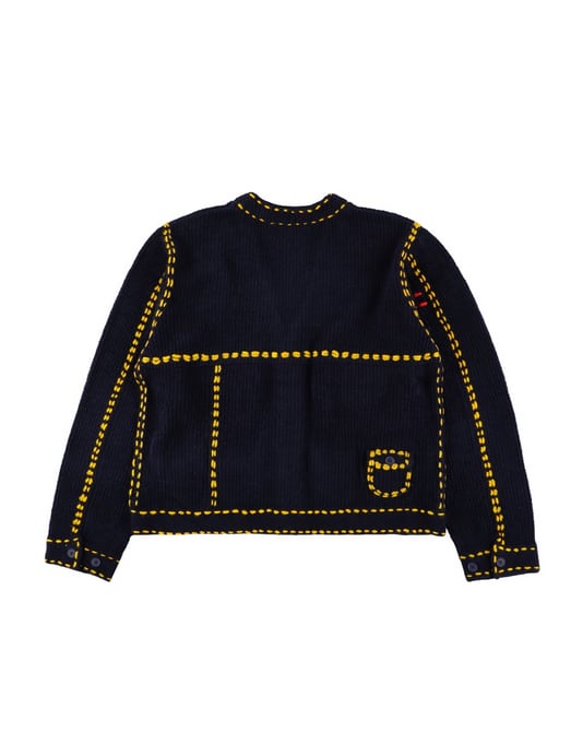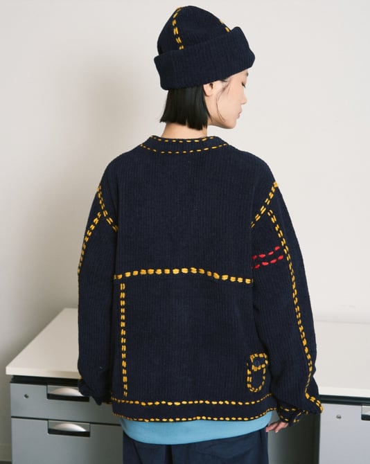 固いイメージのあるユーティリティアイテムを、文字通り柔らかい雰囲気で表現したユーモラスなカーディガンです。