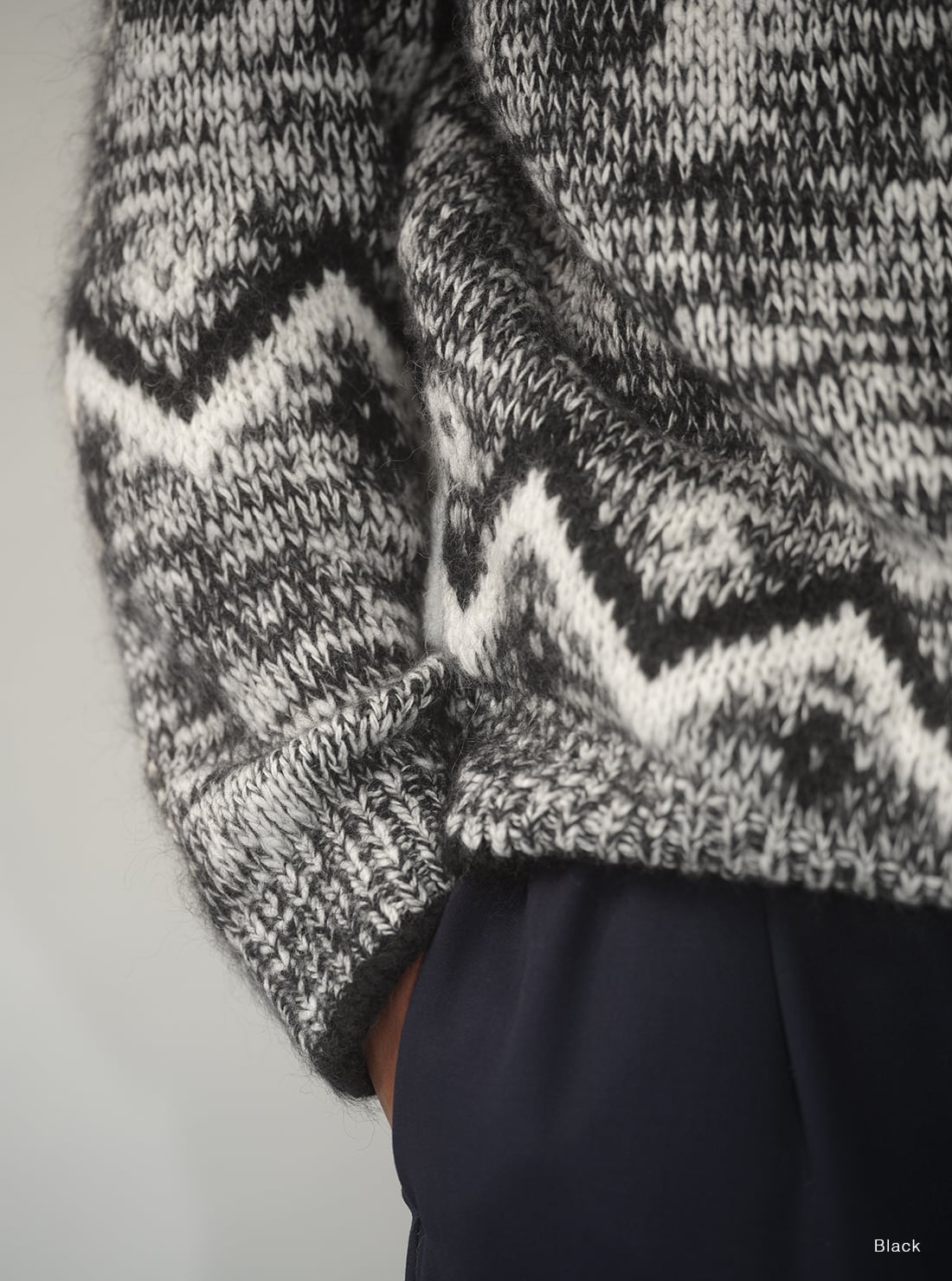 モヘヤ、アルパカ、ウールの天然素材をブレンドした糸に、太番手のスラブヤーンをミックスして編み立てました。モヘヤ、アルパカの起毛感は保ちつつ、スラブヤーンならではのランダムな凸凹感が特徴。