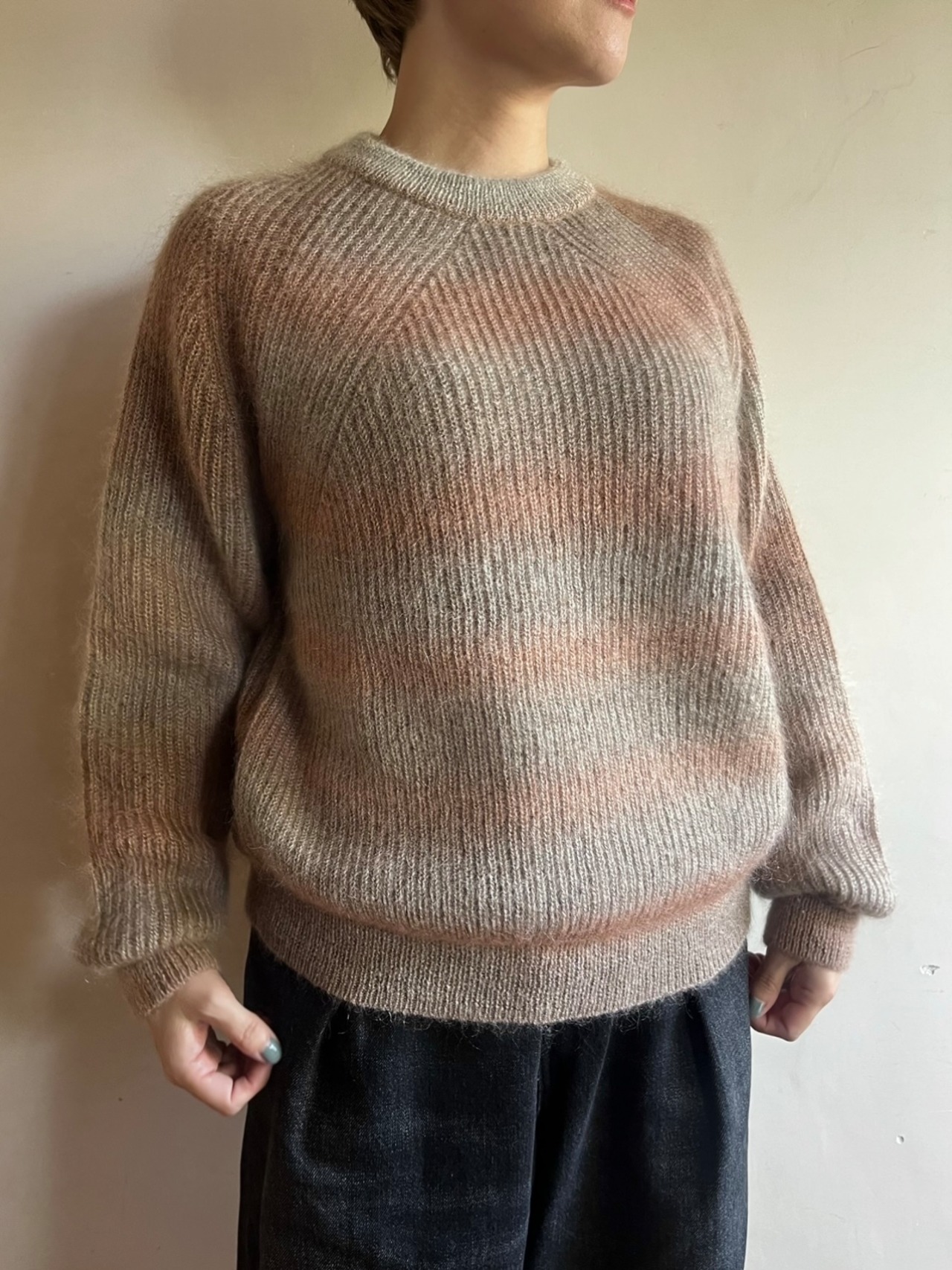 スーパーキッドモヘヤを使用した糸をロングピッチでカスリ染めした商品です。柔らかな肌触りに加えニット特有の染色技法による雰囲気を味わっていただけるシリーズです。※色の出方・表情には個体差があります。