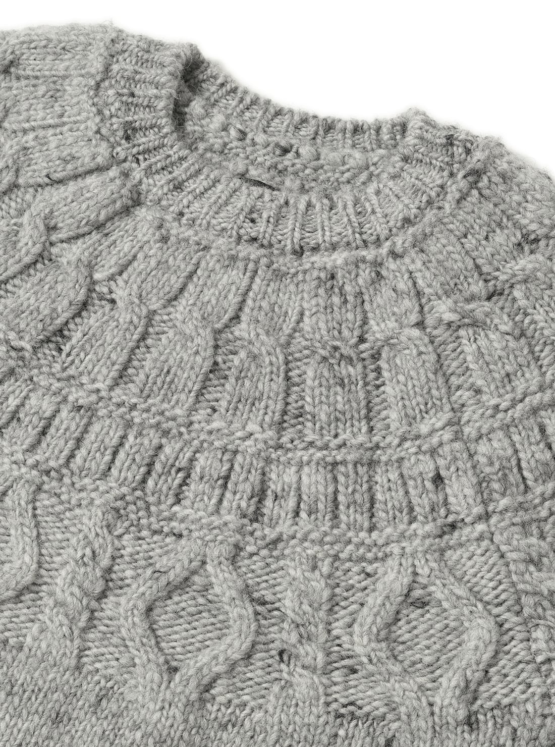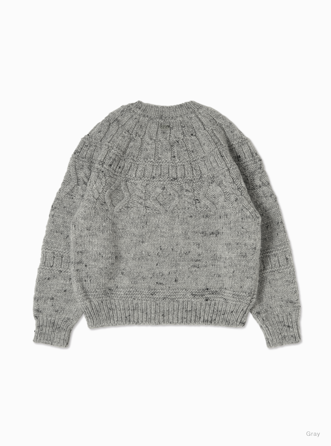 膨らみが強く、シェットランドウール特有の凸凹感が特徴。着丈は短めで、身幅にゆとりのあるデザイン。