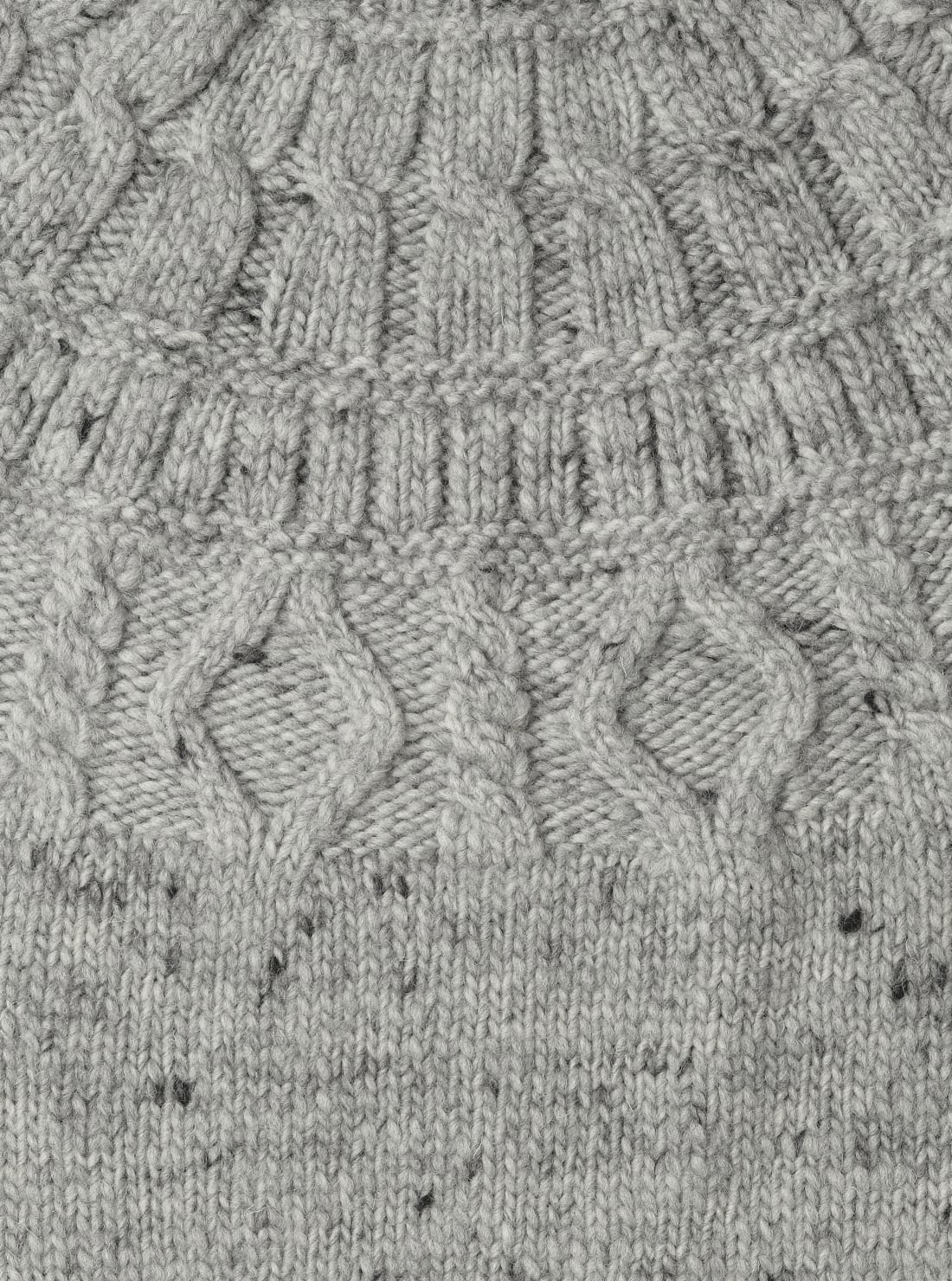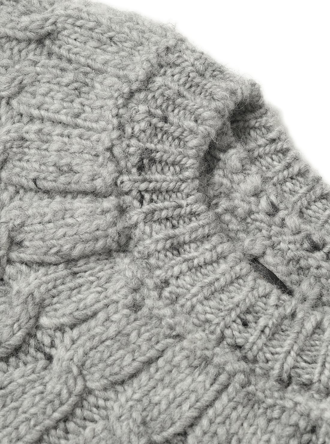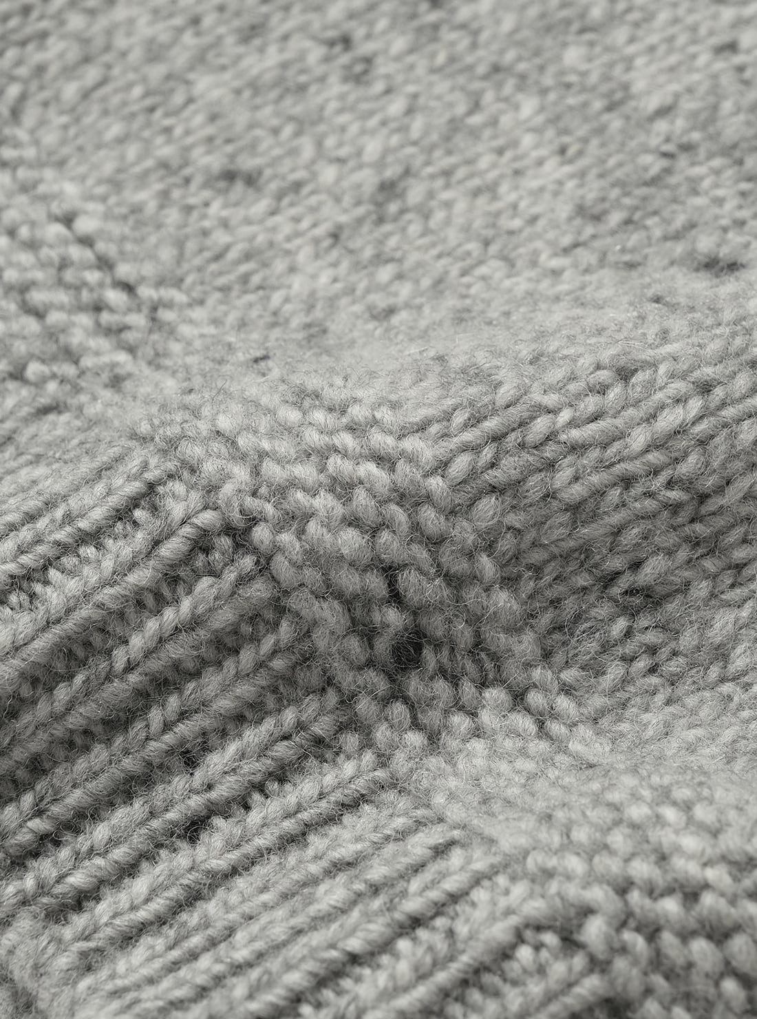 シェットランドウールを極太番手でスラブ状に紡績した糸を使用し、特殊なローゲージ編機で編み立て。