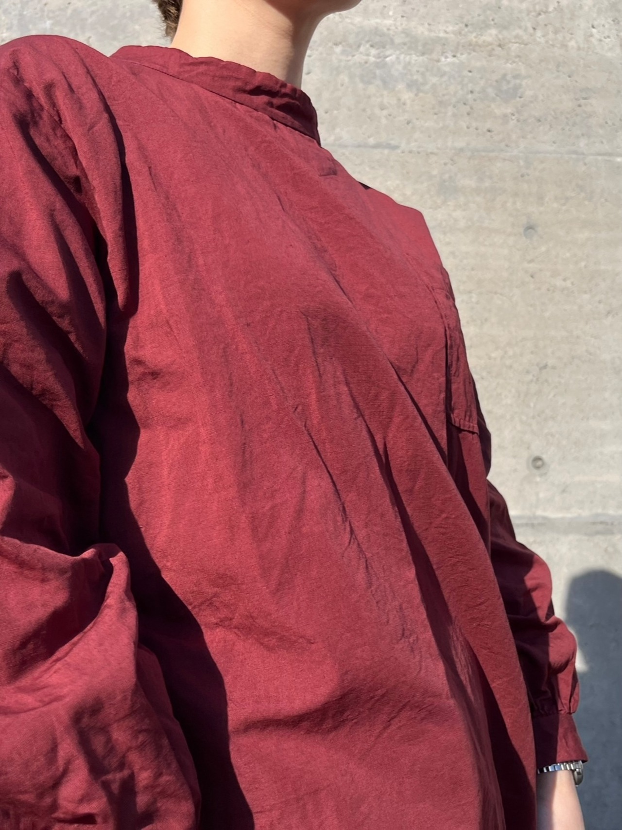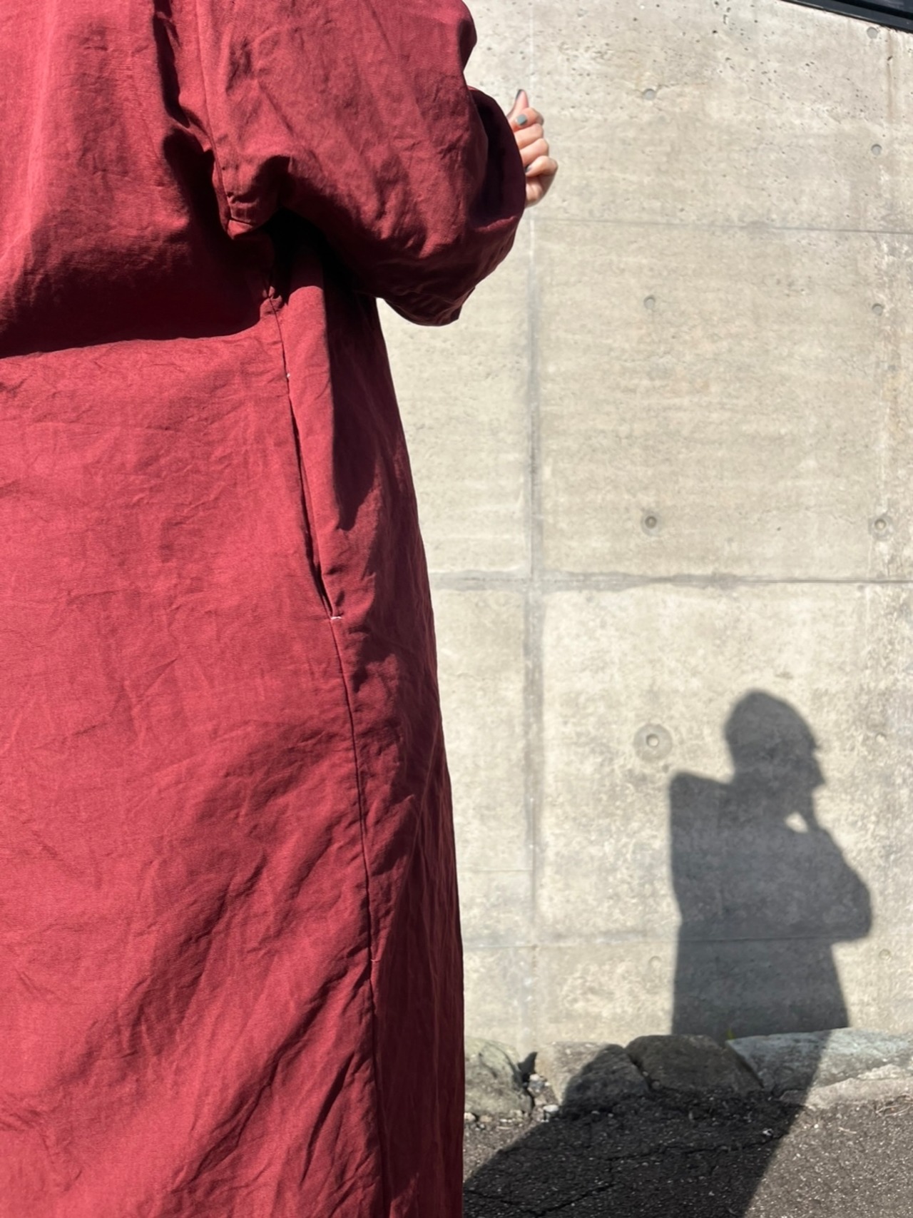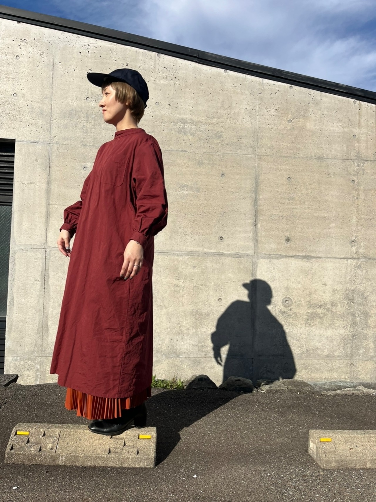 ばさっと羽織って、襟うしろのボタンで留めるだけ。気軽にお出かけできるドレスです。ゆったりと開いた襟はすこし立てて、開放感のある着心地。袖にはギャザーをいれて、後ろ見頃には大きなタックを。シンプルですが、動きやすいドレスに仕上がりました。
