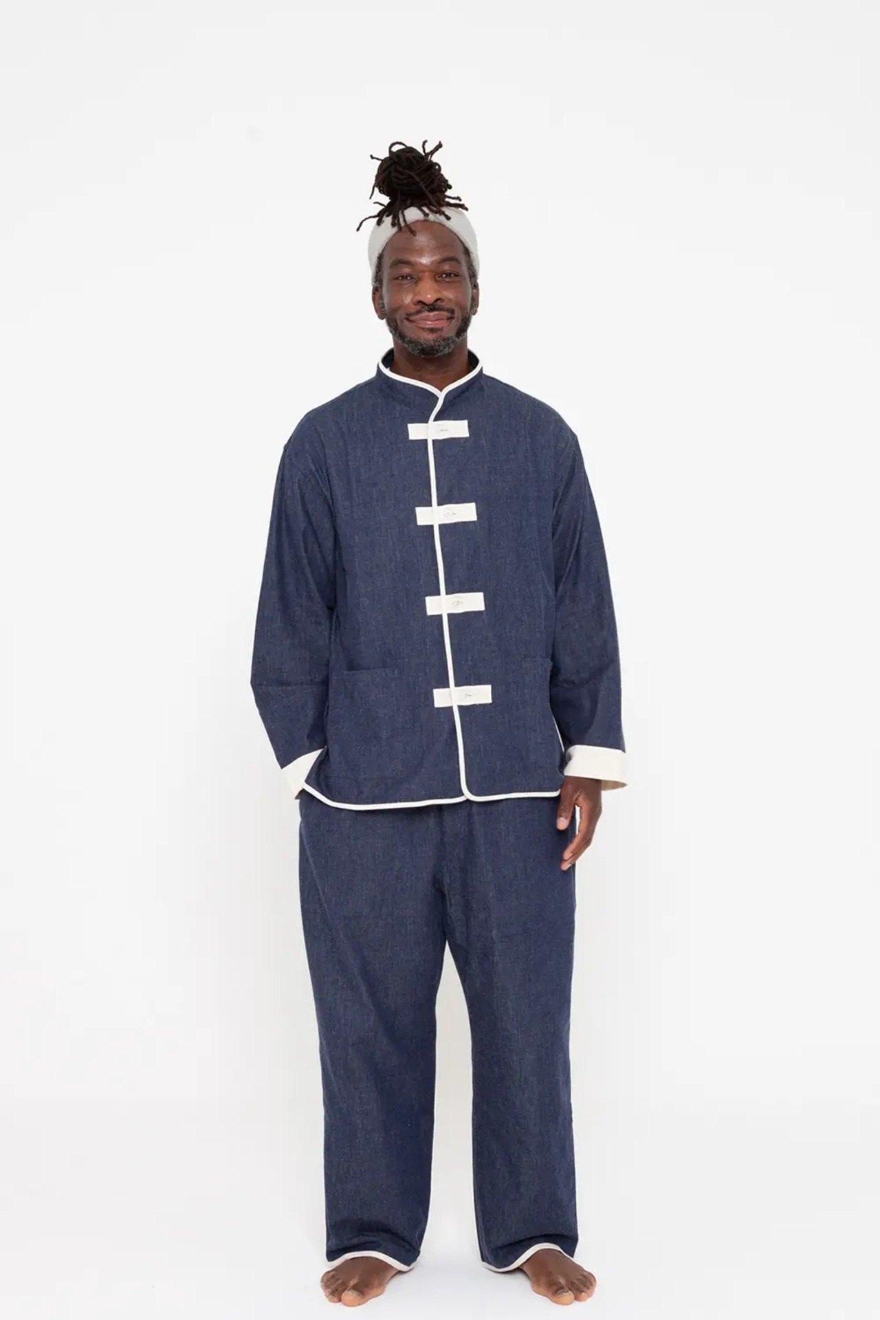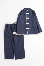 ボタンを留めるだけでチャイナジャケットの雰囲気がでるトロンプ・ルイユ的デザイン。