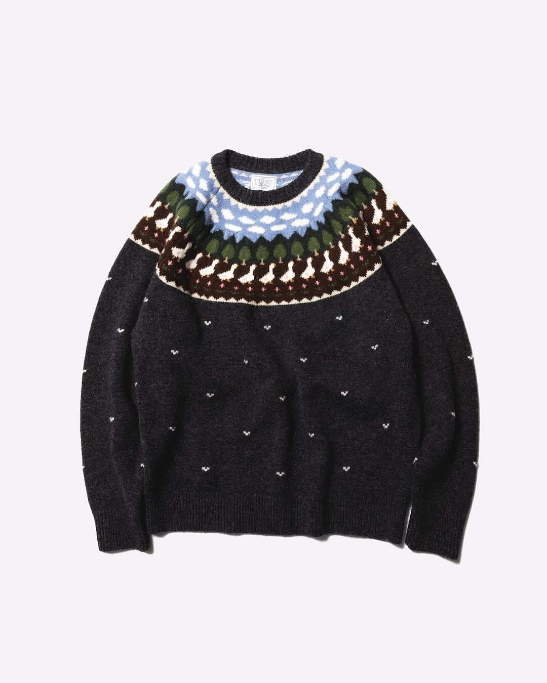求心柄のフェアアイルセーターです。アウトドアブランドがフェアアイルセーターを作成したら?というテーマのもとデザイン。 空、雲、森、アヒル、花という自然風景を求心柄に落とし込みました。アヒルの足跡のような柄を全体に散りばめ、アクセントに。 ラムで編み立て縮絨加工を行、柄を鮮明に表現致しました。