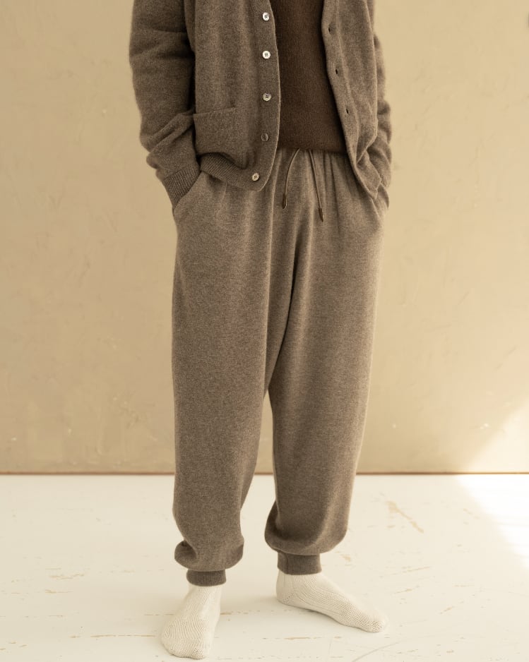 定番で展開しているイノセントヤクのワイドテーパードパンツよりも滑らかさを出すために少し細めでキックバックの強すぎ ないストレッチ糸を一緒にプレーティングしています。 少し深めの股上に広めの渡り幅から緩やかにテーパードし、スウェットパンツのようにダブルのリブを裾に配しています。動 きの中で空気を含んだ YAK に触れる心地よさと、ドレープ感を感じていただけます。