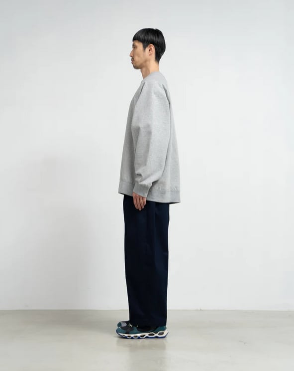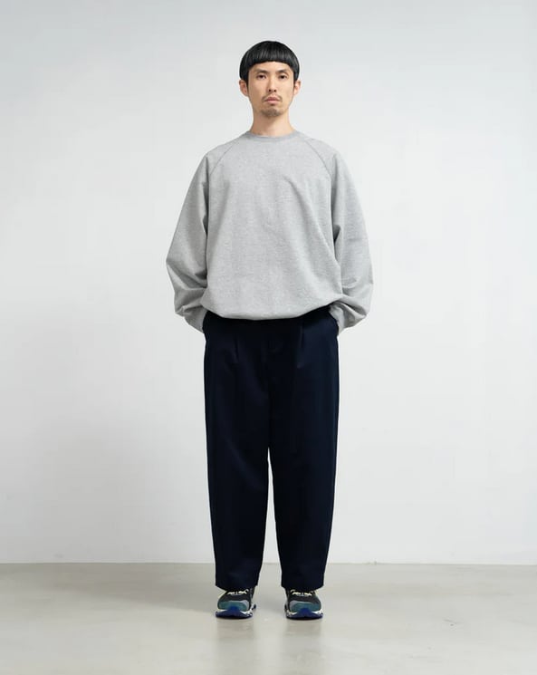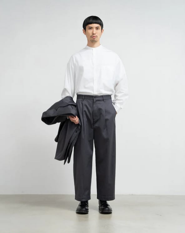 しっとりした光沢と適度な肉厚、上品な表情が特徴の素材。ゆったりとしたテーパードシルエットのチノトラウザー。原材料にアメリカとオーストラリアの均一な繊維長のコットンをブレンドして織り上げたウエストポイント生地を使用。