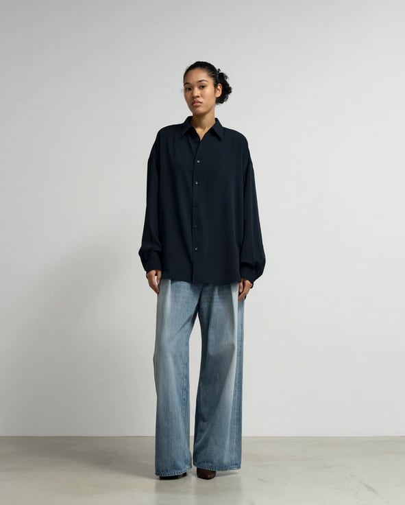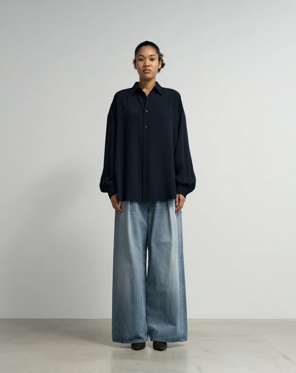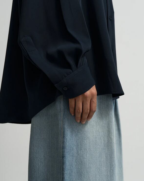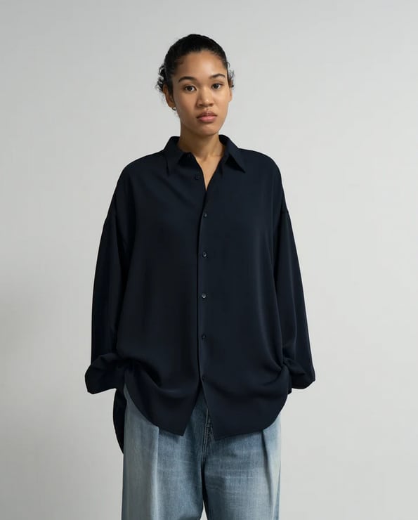 柔らかく落ち感のあるダブルサテンを使用した、レギュラーカラーのオーバーサイズシャツ。シワになりにくく日常的に使える利便性も兼ね備えた一着です。たっぷりとボリュームのあるシルエットが動くたびに揺れ、美しくドレープします。