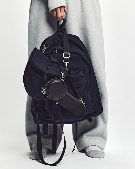 ボトムのレザーストラップは脱いだアウターやシャツを丸めて収納できるようにデザインした簡易的なストラップです。