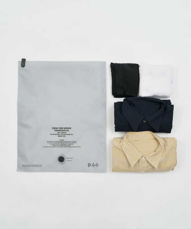 旅に最適な圧縮バッグの2枚セット。厚手で高密度に織られたポリエステル×ポリエチレン混紡の素材を使用し、耐久性と軽量性を両立。衣類やタオルなどかさばるアイテムをスマートに圧縮し、限られた旅のスペースを最大限に活用できる。W40×H50cmのMサイズは、数日の旅行に最適な容量感。ロック機構付きのバルブで空気をしっかり排出し、バッグ内の圧縮をキープ。ジップ式開閉で使用も簡単。無駄を省いたミニマルなグラフィックも魅力。使い終わったら畳んでコンパクトに収納でき、旅のパッキングをスマートにアップデートする旅支度の新定番。