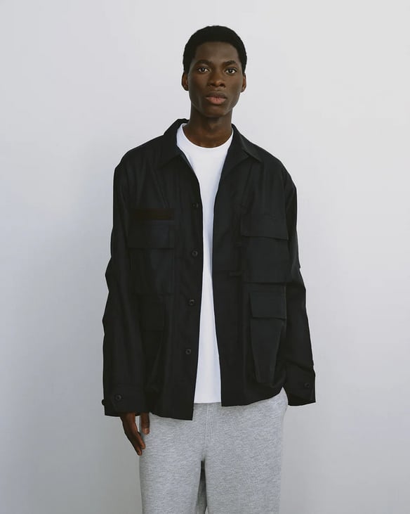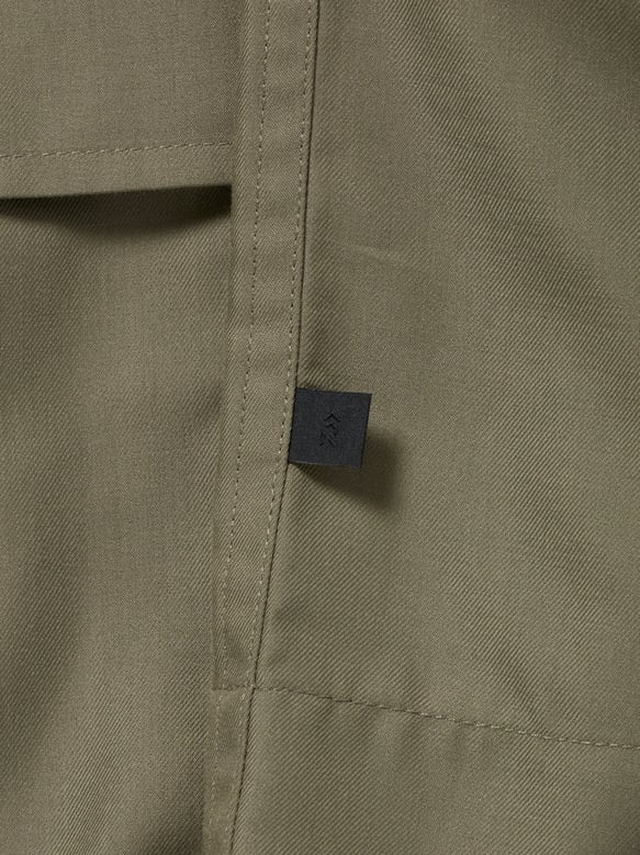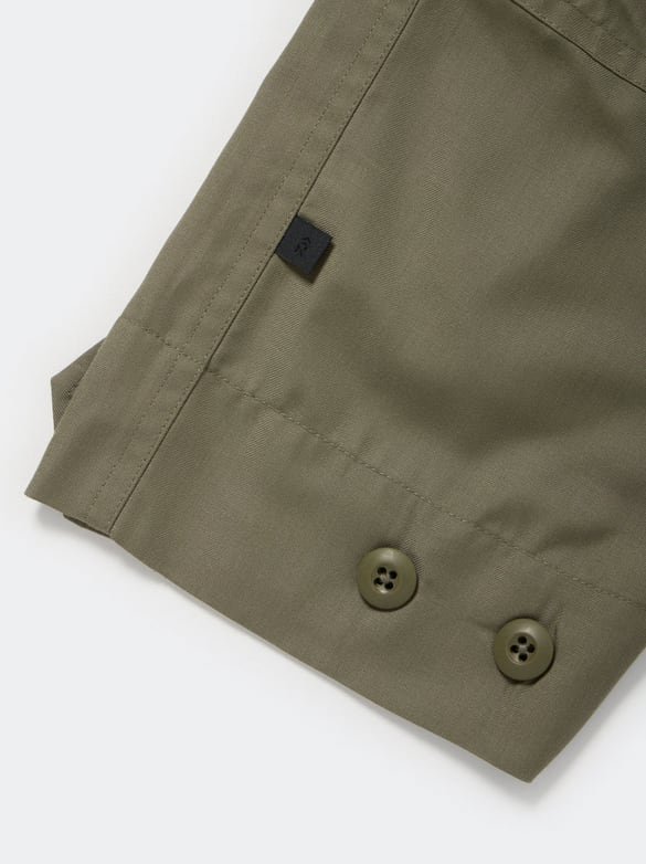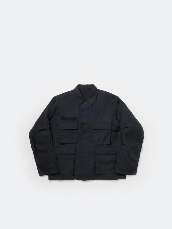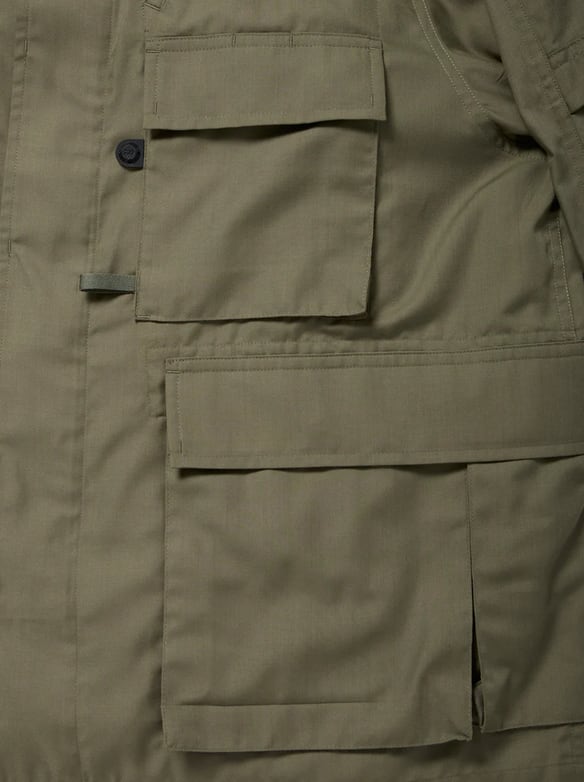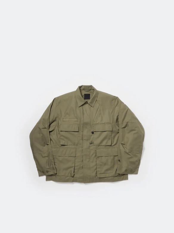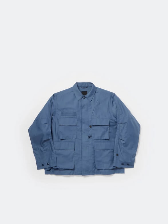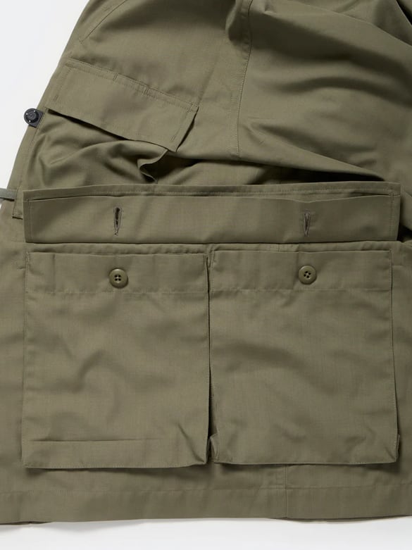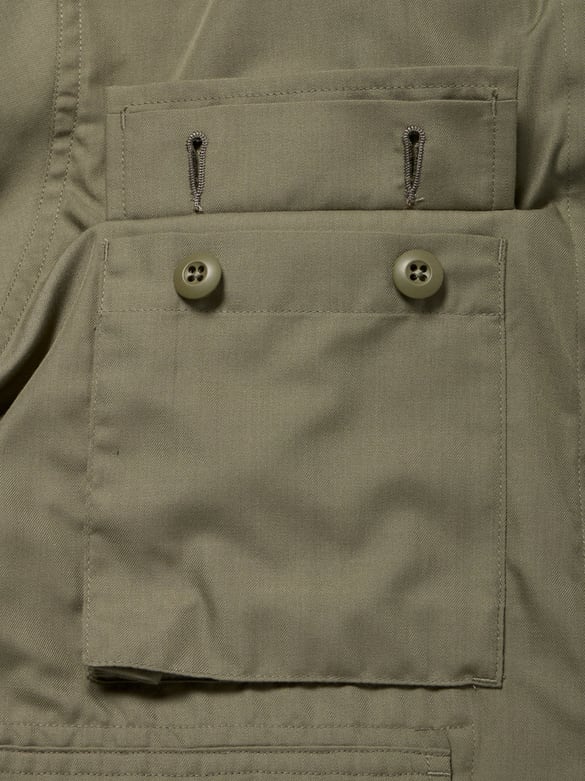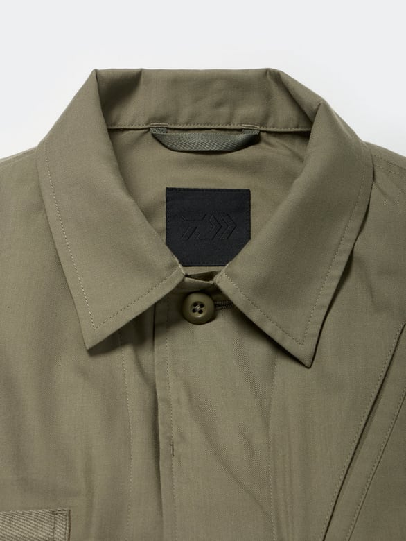 シャツ生地を使用し一枚仕立てでライトウェイトにデザインしたミリタリーフィールドシャツジャケット。サイドに跨るフロントポケットは、ハンティングのポケットワークよりインスピレーションを受けデザイン。軽量ながらも胸ポケットやジッパーポケットなど種類様々なポケットワークを施した。ミリタリーウエアの特徴である袖のアクションプリーツを加え、フィッシングの際キャスティングしやすいディテールを追加。