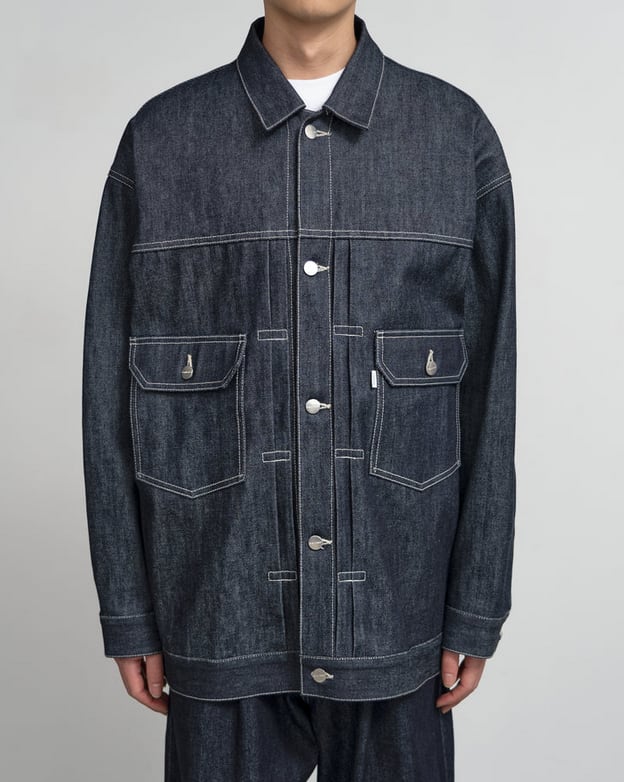 130年もの歴史を誇る米国Cone Denim社が作る13.75オンスのセルビッチデニム。旧式力織機でゆっくりと織り上げることで生まれる、生地表面のざらっとした凹凸やムラがデニム本来の風合いを感じさせる魅力的な素材です。’50年代に誕生した往年のデニムジャケットのディテールを継承しながらも立体的にボリュームのあるシルエットを構築。ロゴの刻印入りのタックボタンと襟ぐりにはクリーンなヌメ革のパッチを施しました。長く着込むことで味わい深く、美しく色褪せていきます。