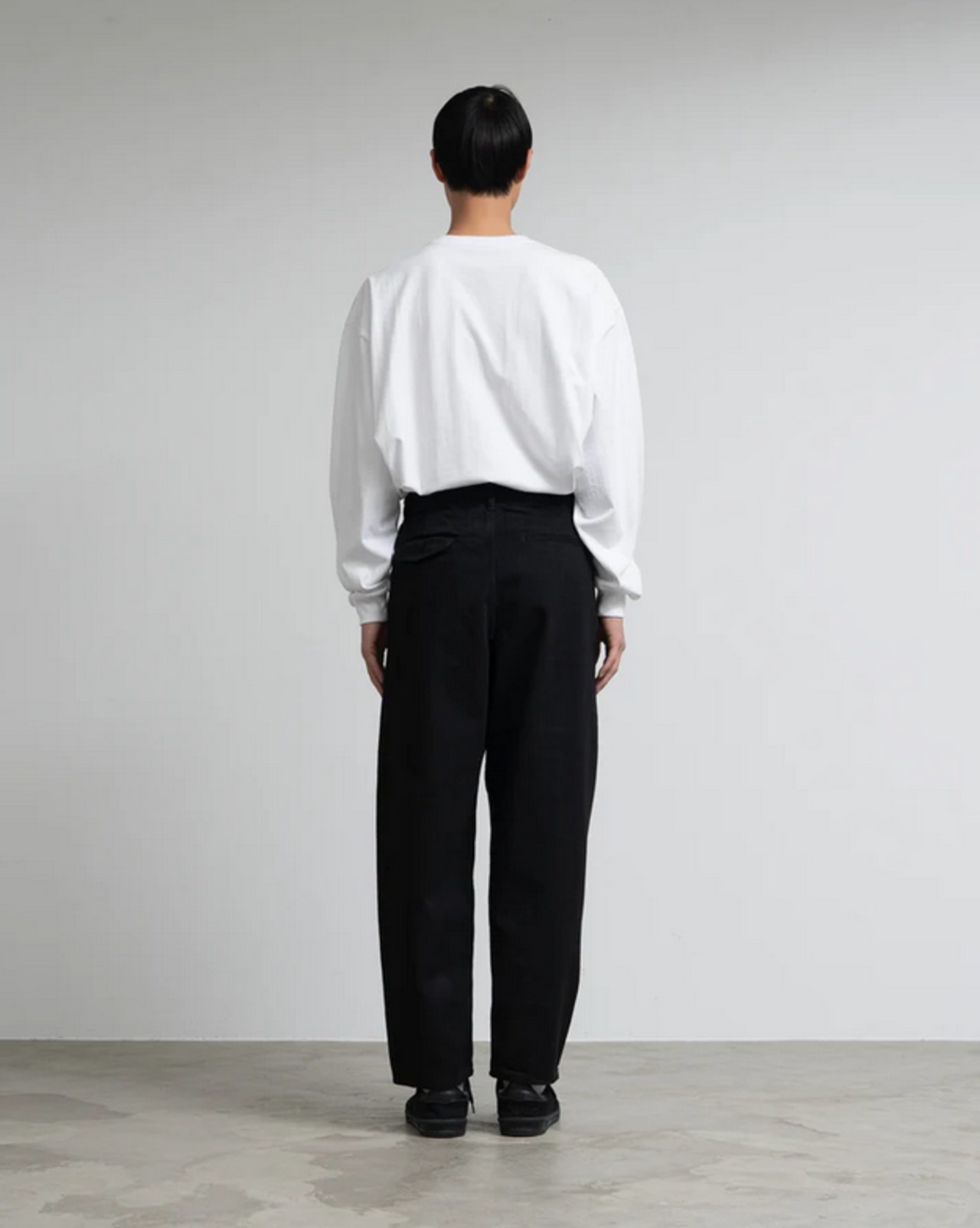 130年もの歴史を誇る米国Cone Denim社が作る13.75オンスのセルビッチデニム。ゆったりとした腿回りで太めのストレートシルエットが特徴のファイブポケットパンツ。旧式力織機でゆっくりと織り上げることで生まれる、生地表面のざらっとした凹凸やムラがデニム本来の風合いを感じさせる魅力的な素材です。ロゴの刻印入りのタックボタンを配し、クリーンなヌメ革のパッチがウエストを飾る。