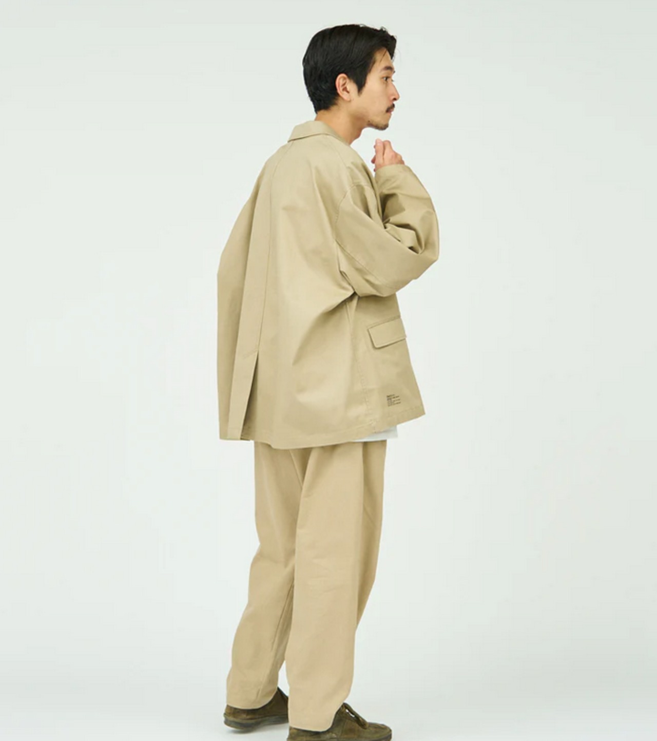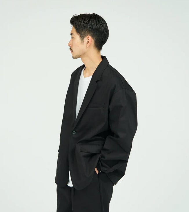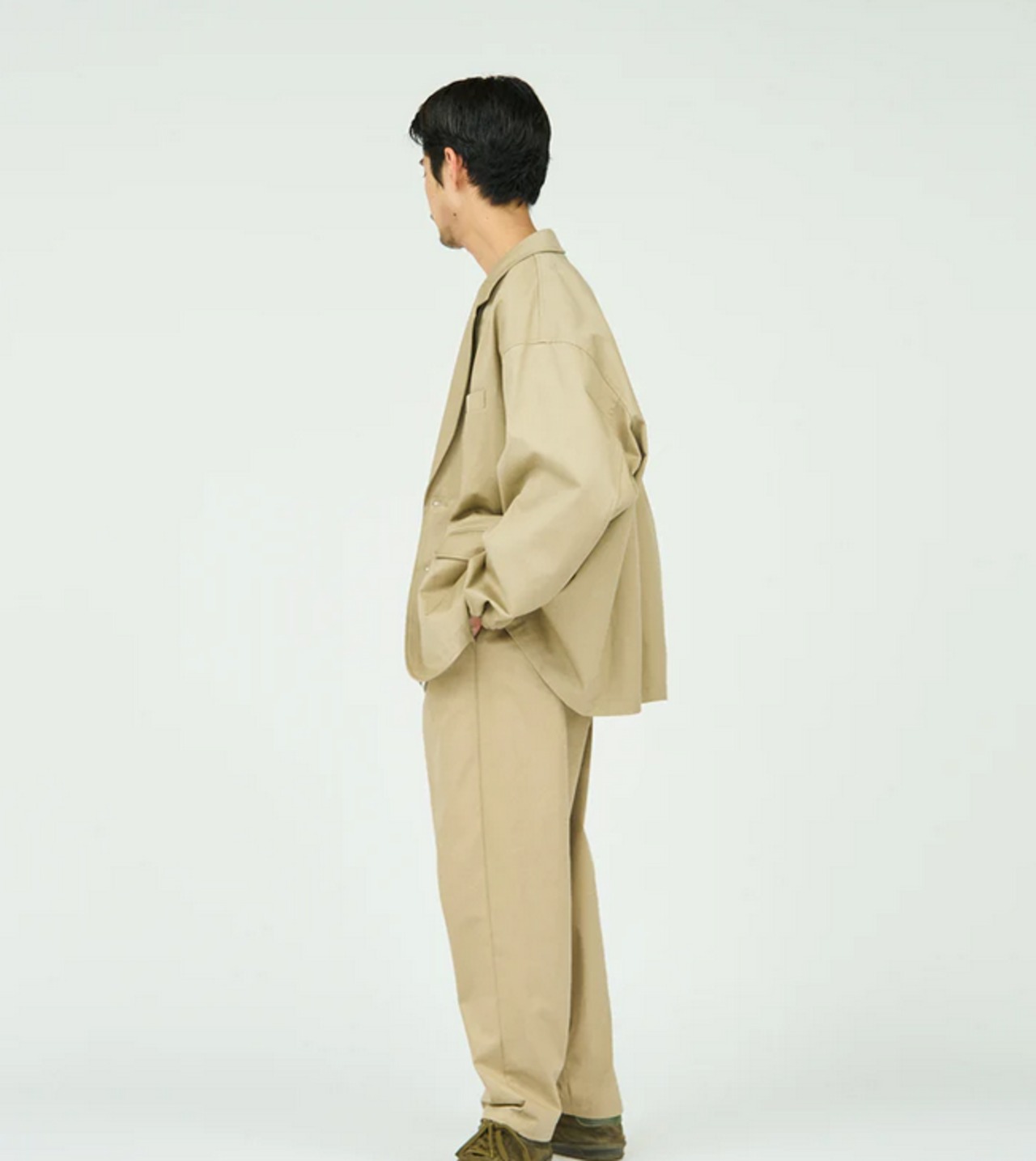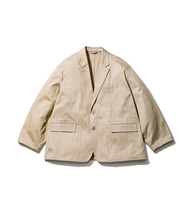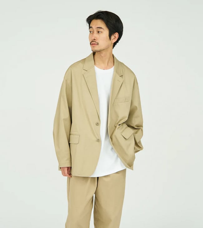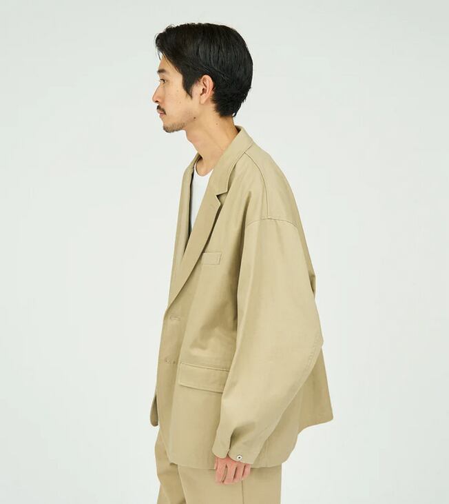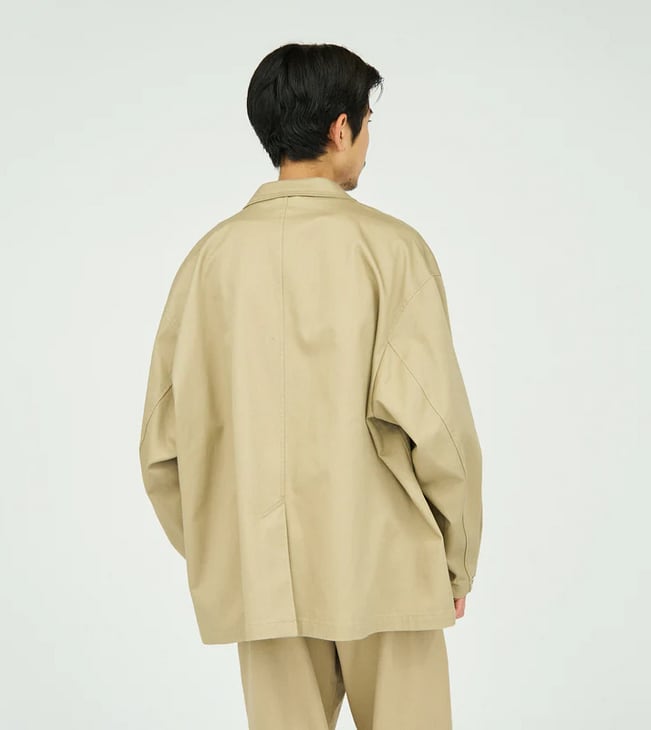 ボリュームのあるシルエットが特徴のチノジャケット。太番手の糸で織り上げたチノクロスは、ドライな質感と高い耐久性を兼ね備え、着込むほどに身体に馴染む風合いが魅力です。袖口にはスナップボタンを配し、袖丈の調整も可能。洗濯しやすく扱いやすい素材で、日常使いはもちろん、シンプルで清潔感のある着こなしにも自然と馴染む一着です。