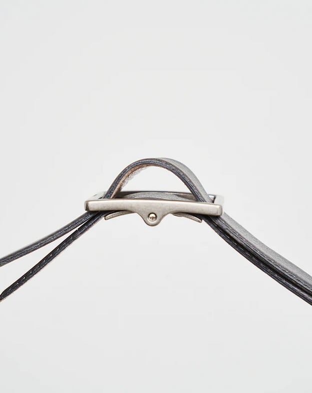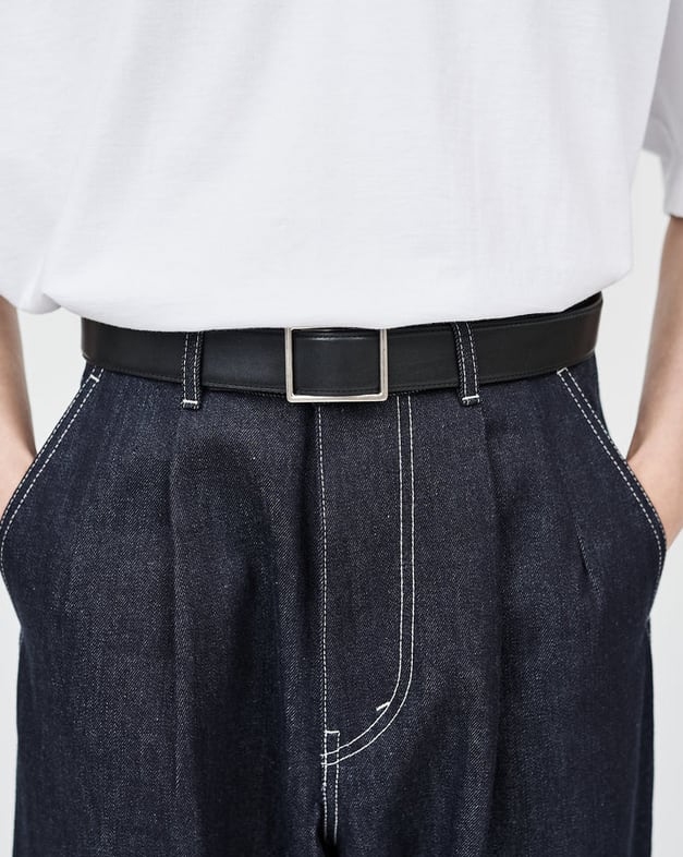 バックルのピン、ホールがなくフリーサイズで微調整が簡単にできるベルト。オイルをたっぷりと含み、しっとりとした質感としなやかさが特徴のイタリア産の牛ショルダーを使用。使い込むうちに艶が出て味のある経年変化を楽しめます。ベルト帯の中央を盛り、縁にステッチを飾るフェザー仕立て。