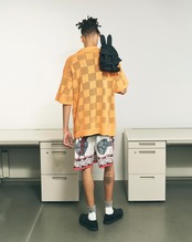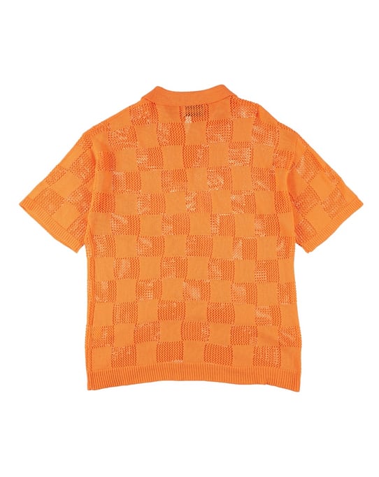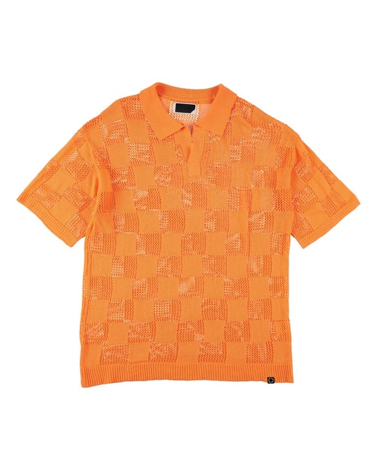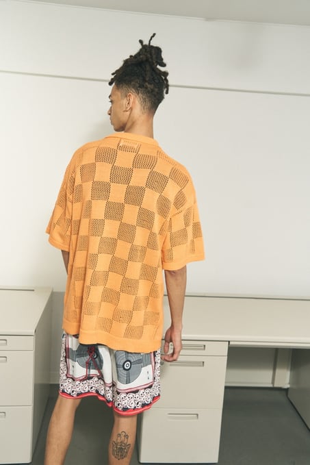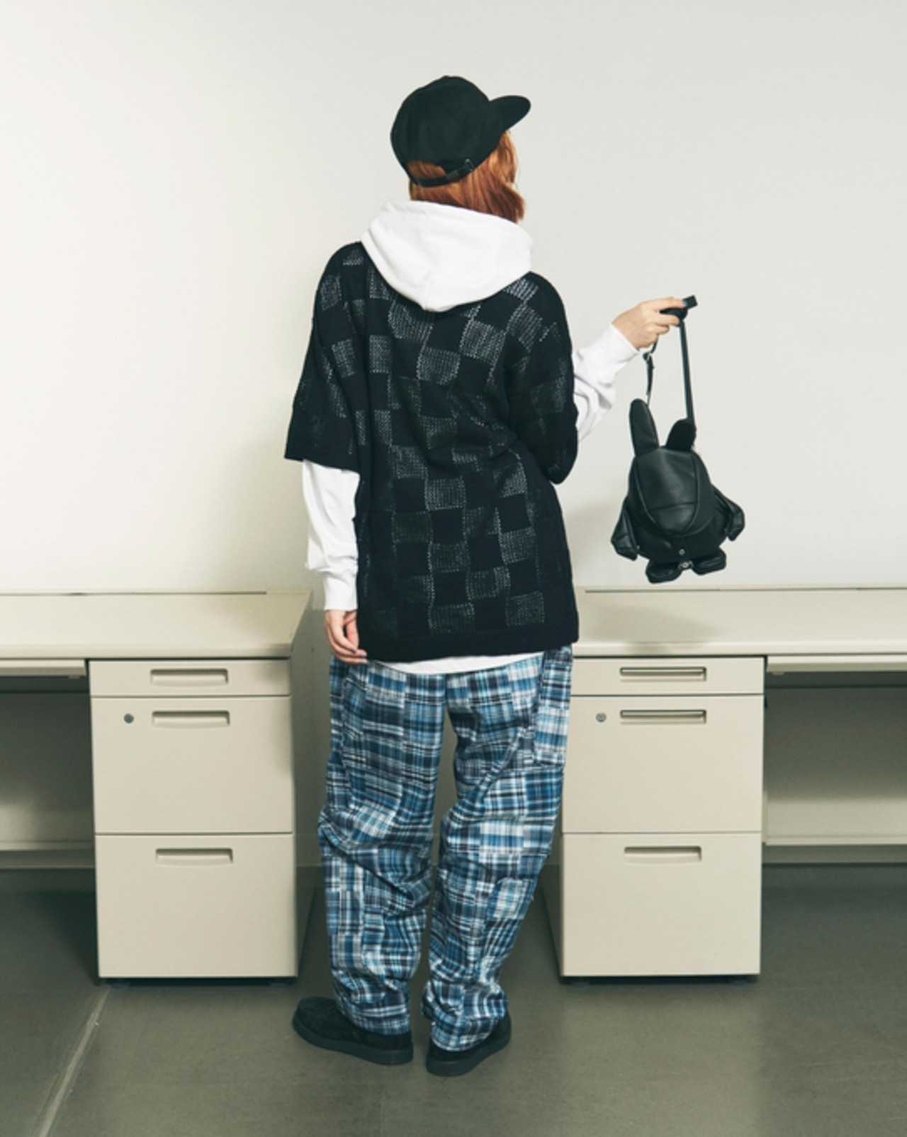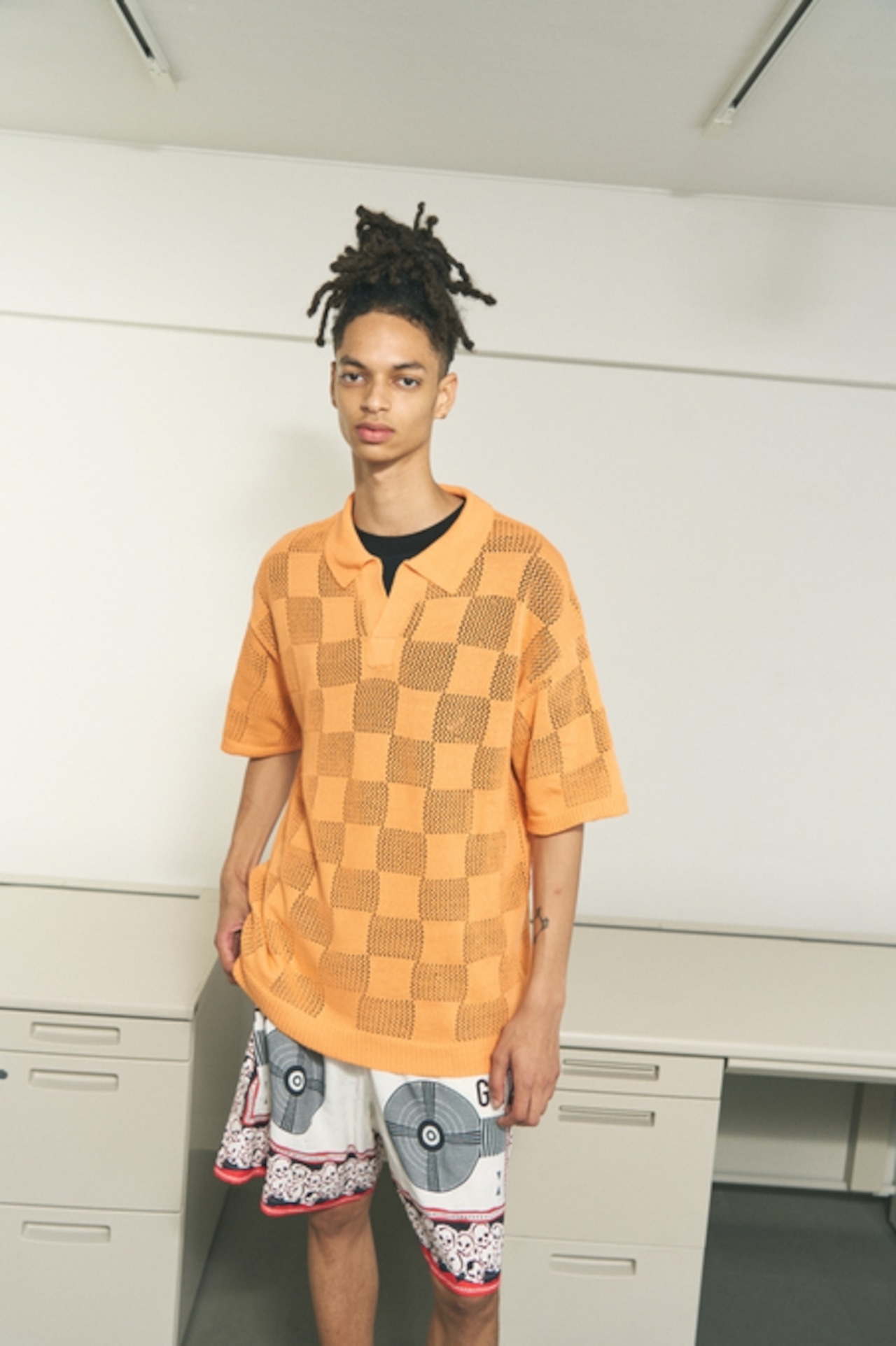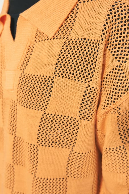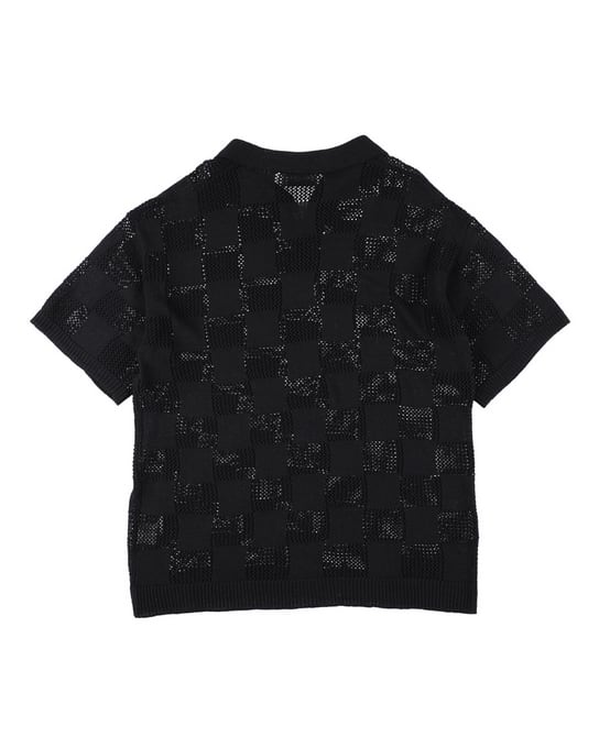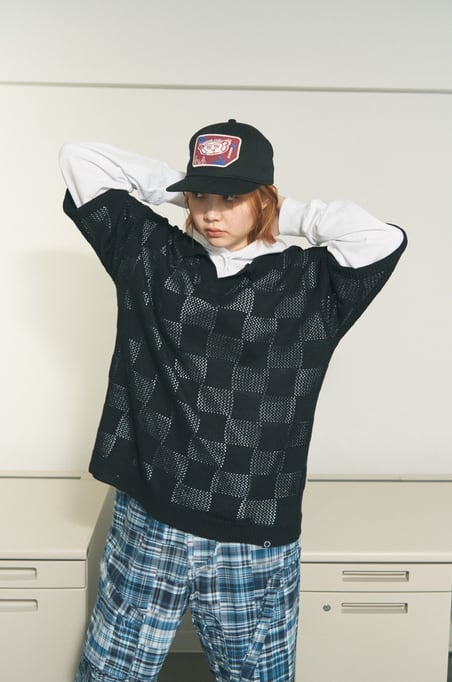 A sheer semi see-through knit crafted with two types of gradient knit work to reinterpret the classic checkerboard pattern. Varying levels of transparency add depth, introducing a fresh approach to layering . Ideal for pairing with your favorite graphic tees, or undergarments. Its soft, mosaic like sheerness keeps it light and breathable even when worn on its own.
