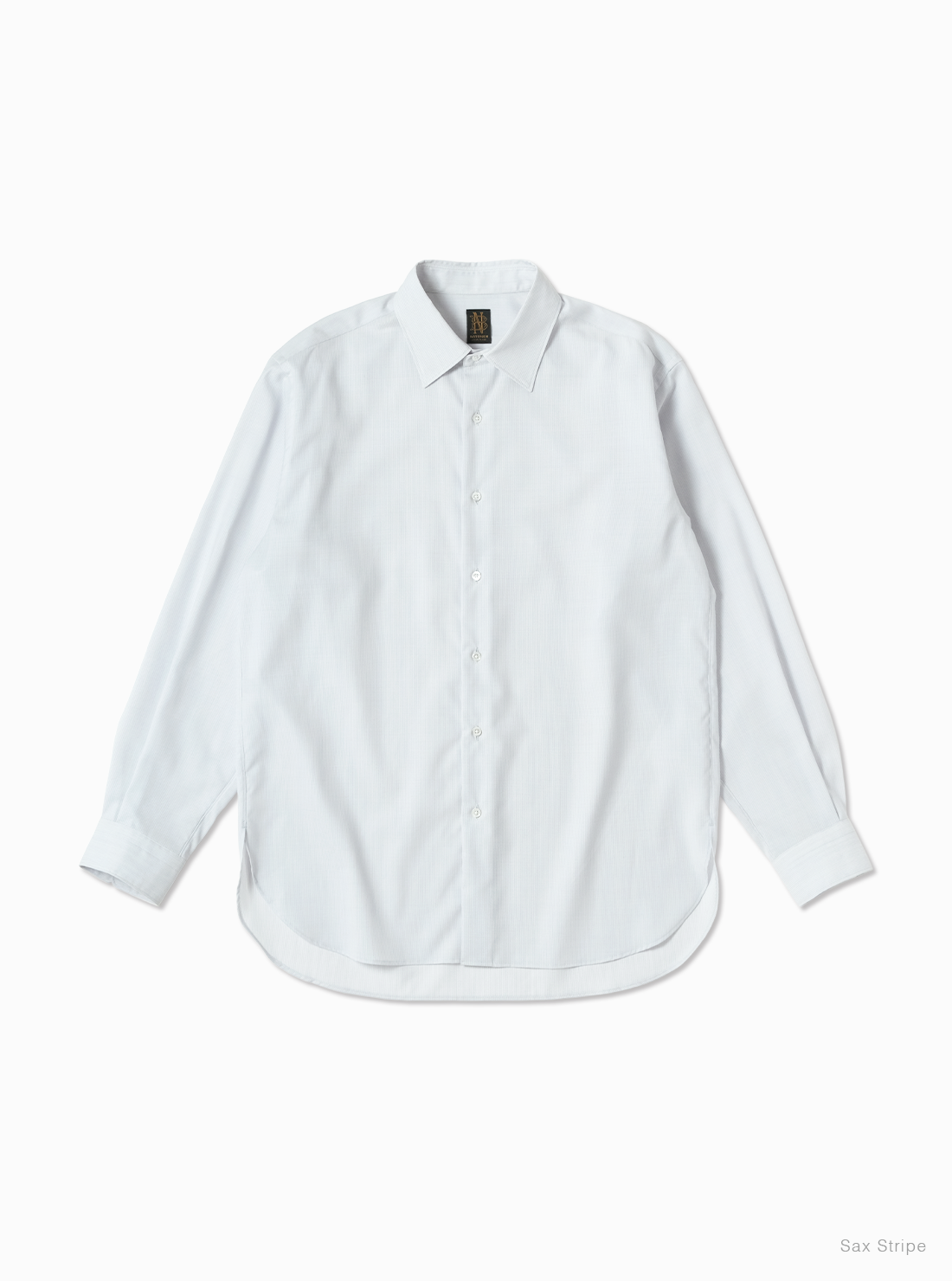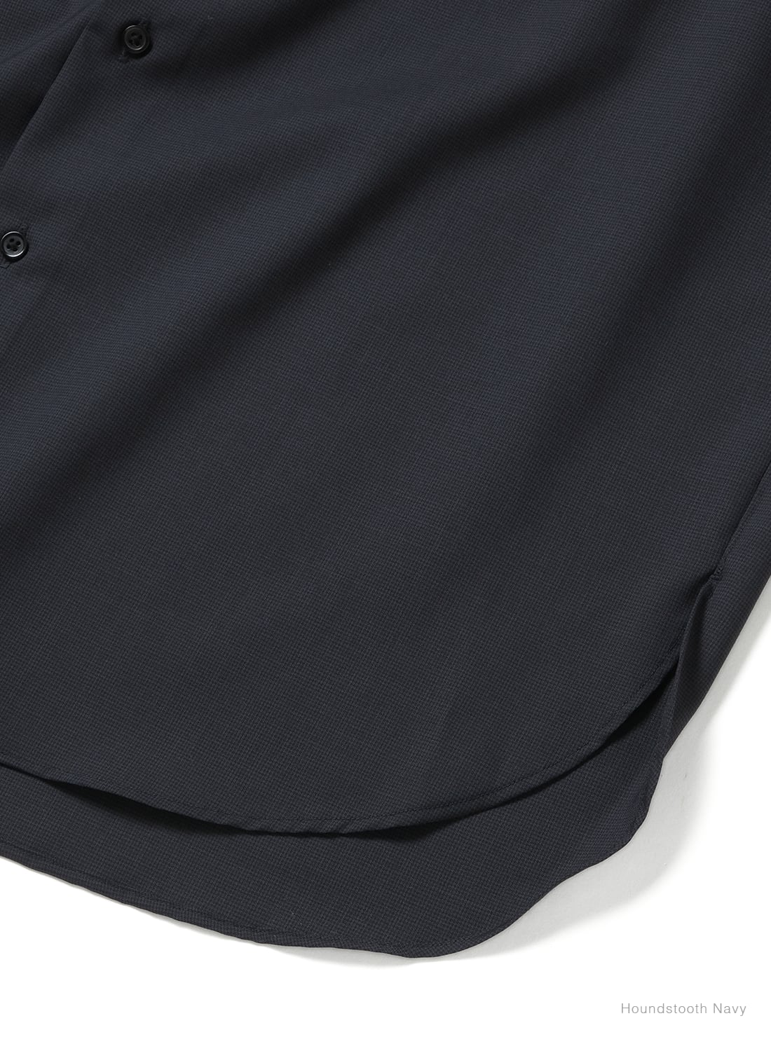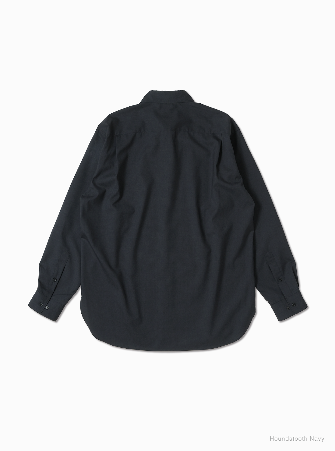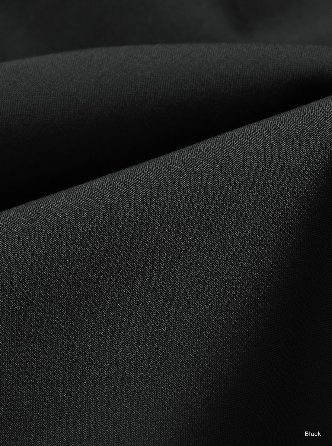 ウール特有の上品な光沢感と、美しいドレープが特徴。毛羽を極限まで抑えることで、軽やかでさらりとした肌触りを実現。吸湿性にも優れ、蒸れにくく、通年の着用を想定した快適な素材。両肩にタックを入れたサイドタック仕様。