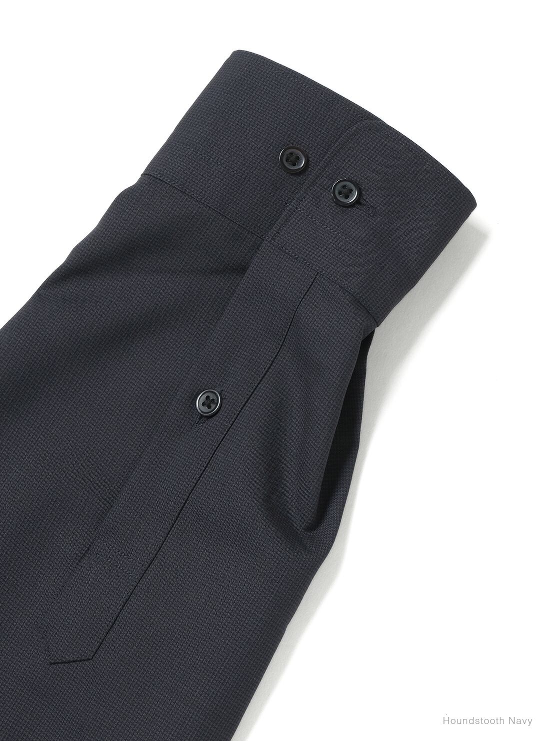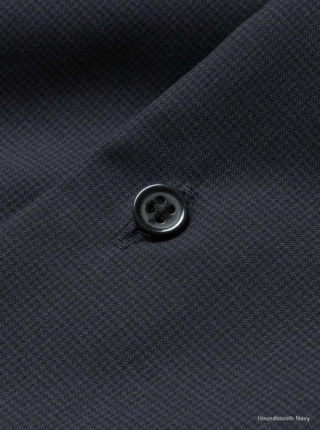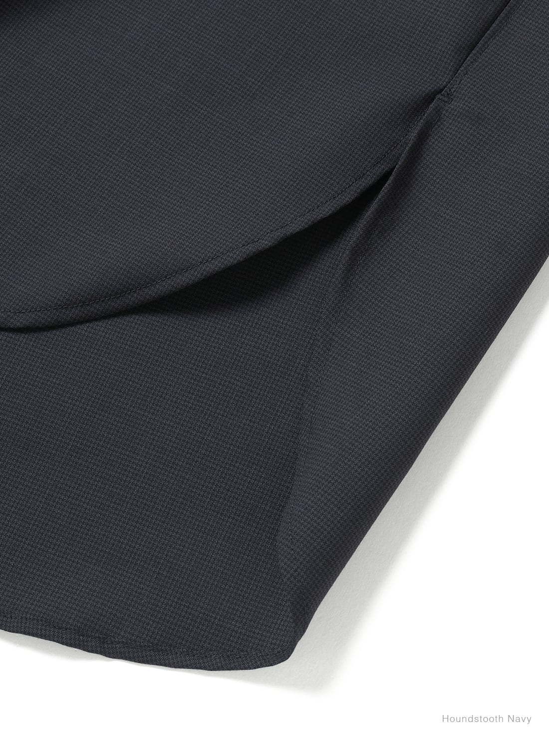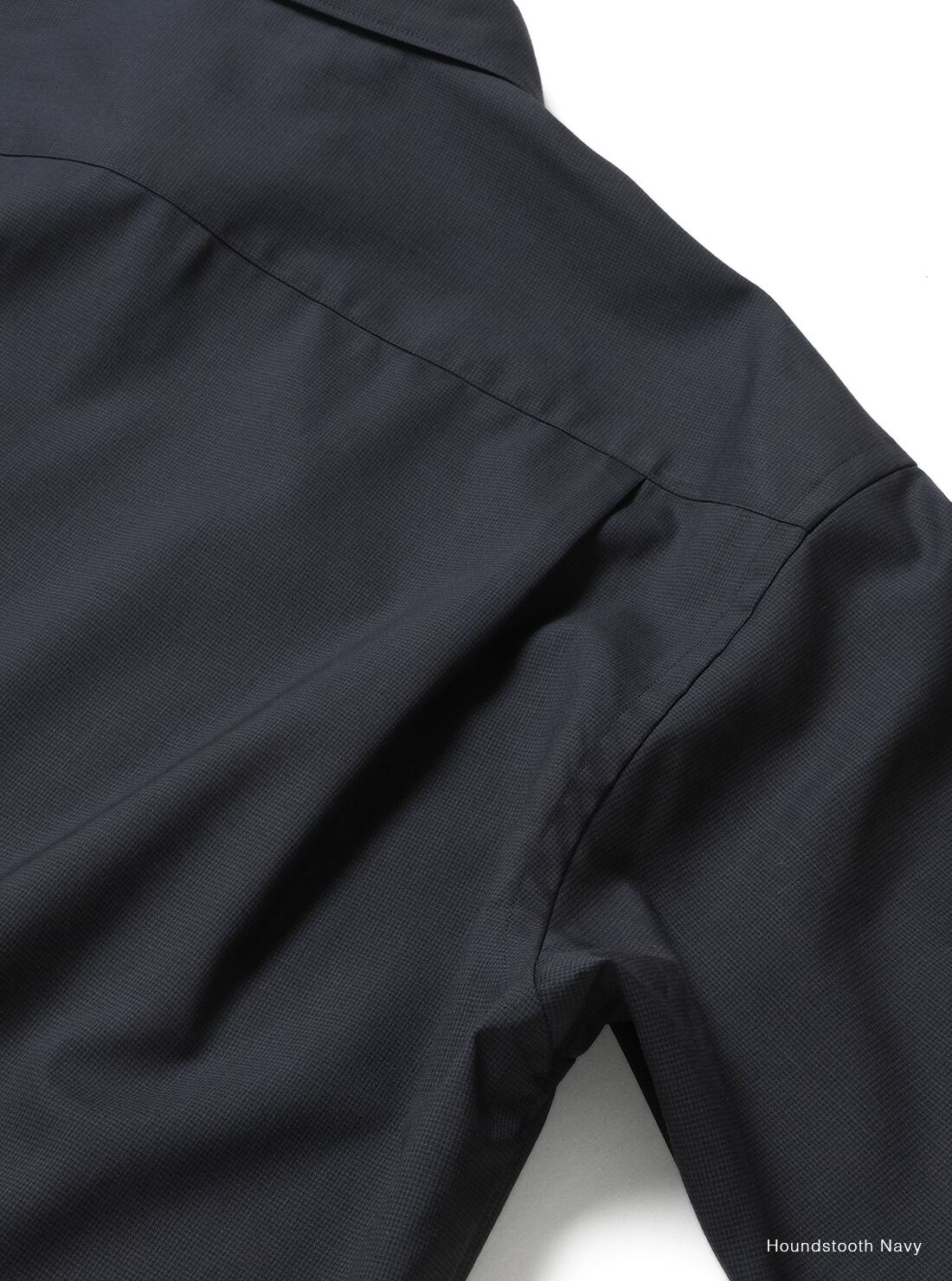 ウール特有の上品な光沢感と、美しいドレープが特徴。毛羽を極限まで抑えることで、軽やかでさらりとした肌触りを実現。吸湿性にも優れ、蒸れにくく、通年の着用を想定した快適な素材。両肩にタックを入れたサイドタック仕様。