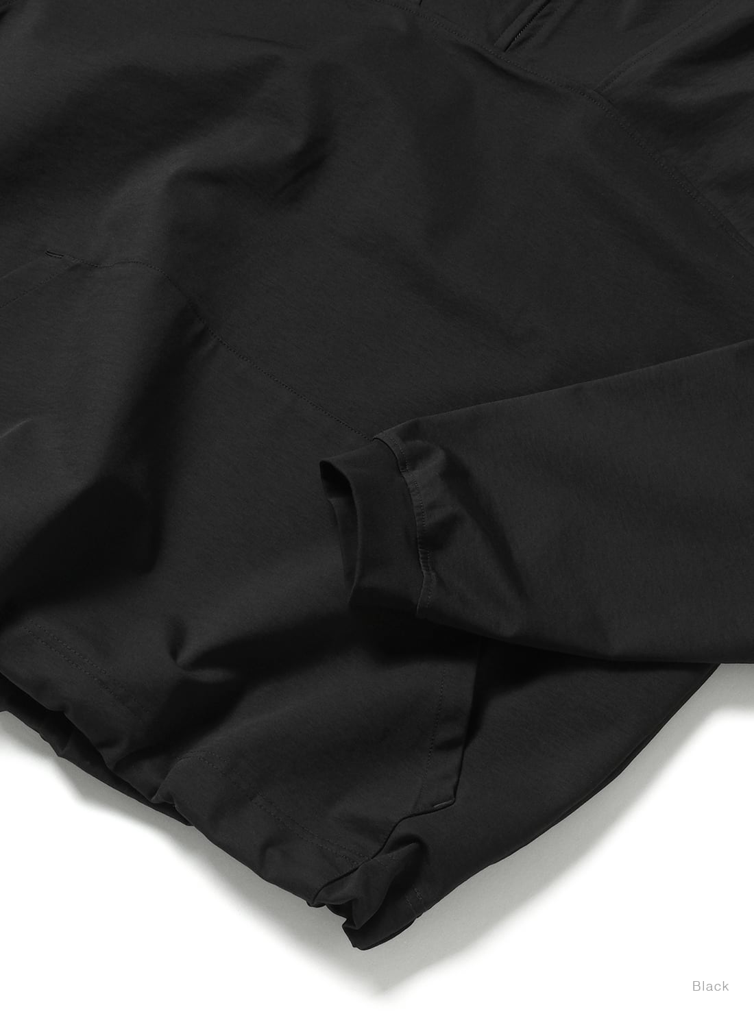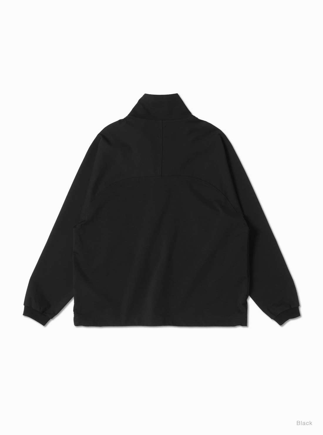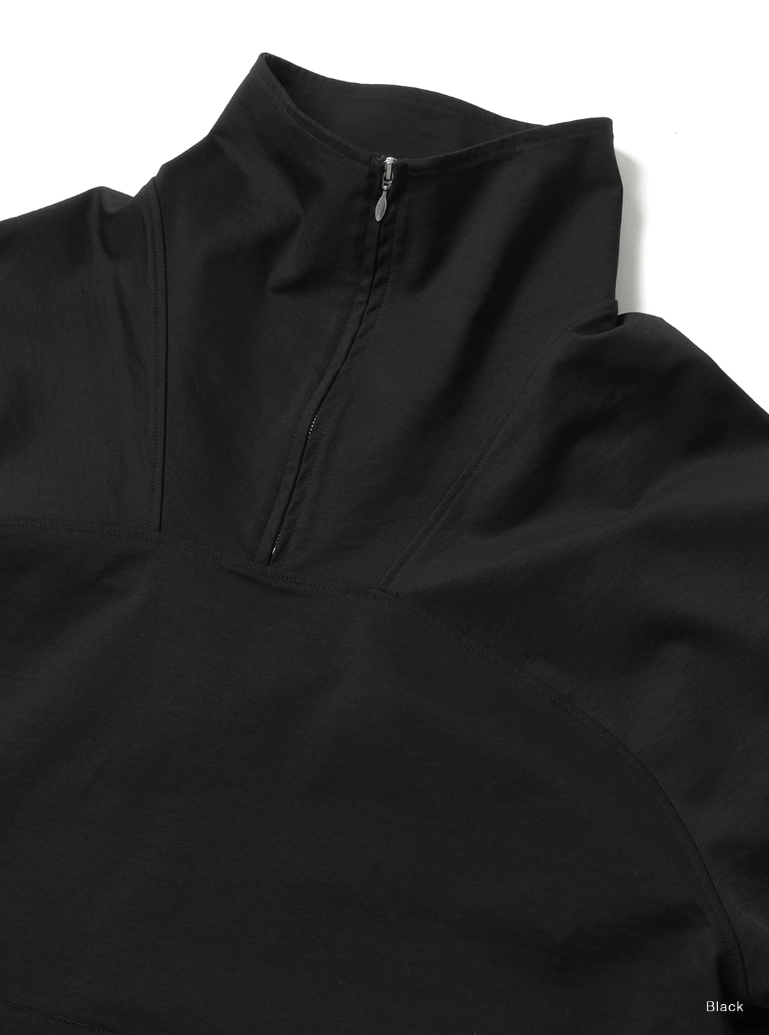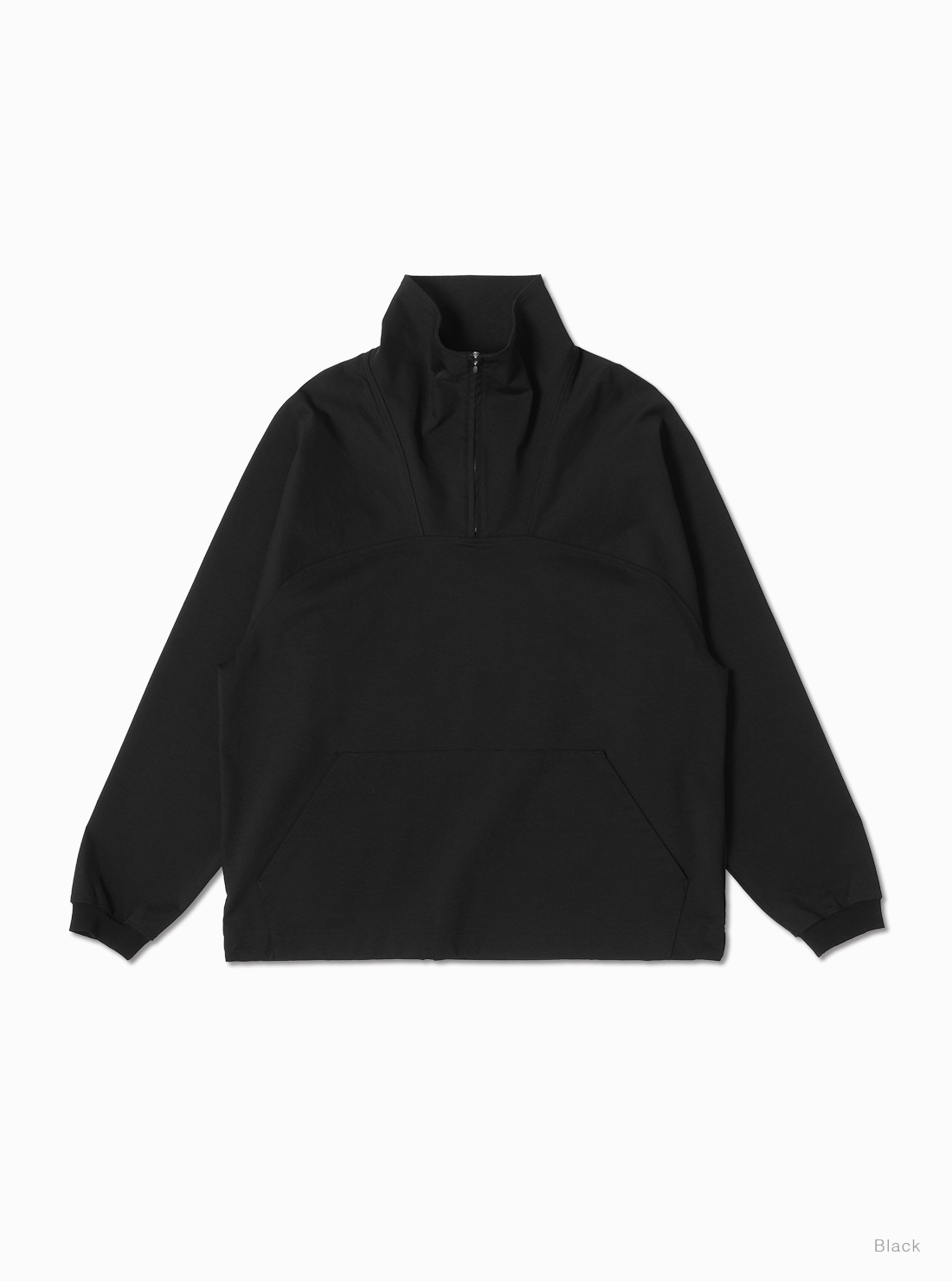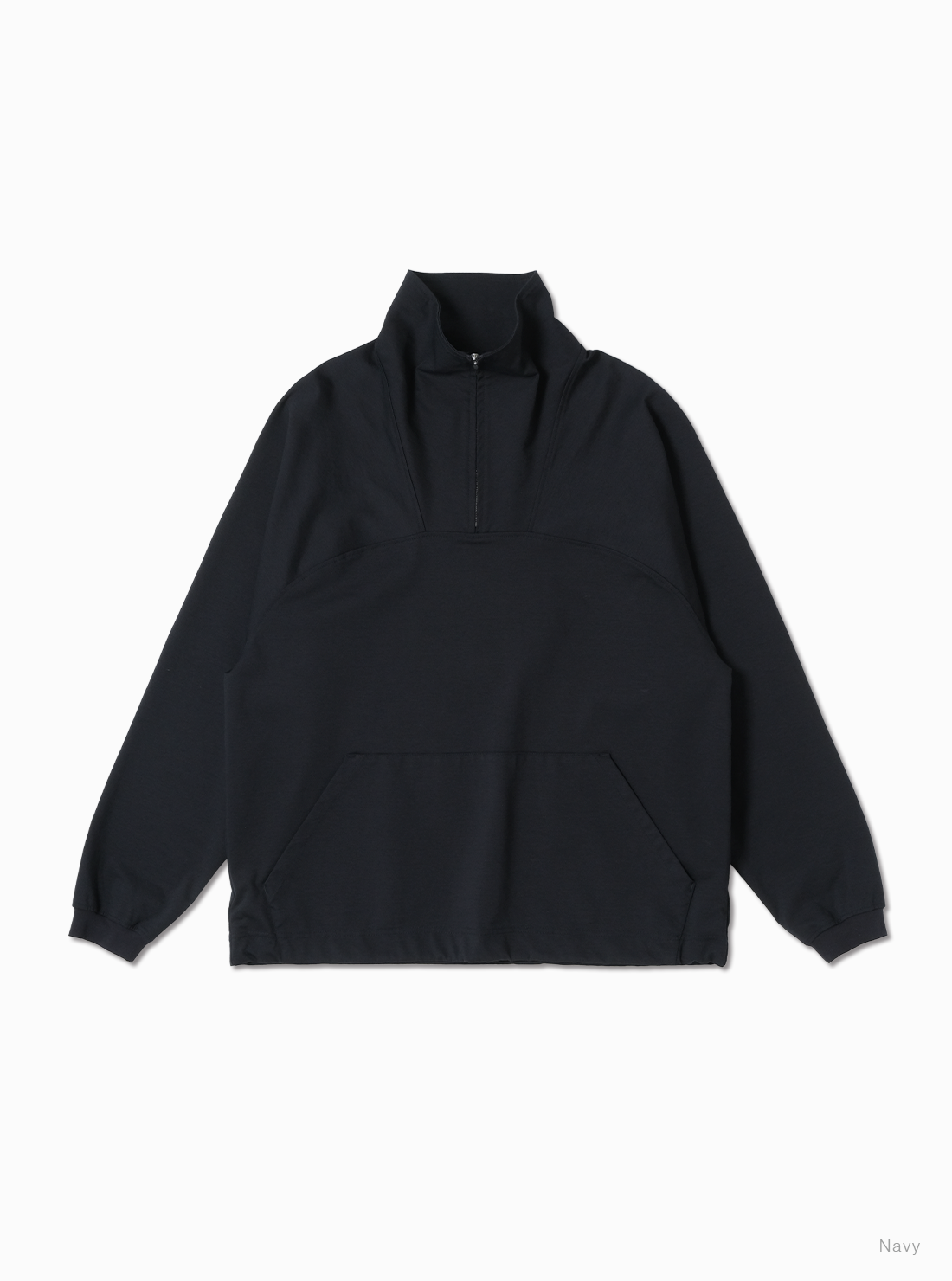 極細番手のスーピマコットンに、伸縮性と耐久性を高めるナイロン糸をブレンド。スムース編みを採用し、超ハイゲージの編機で丁寧に編み上げた生地を使用。サラリとした肌触りと、日常使いにも適した耐久性が特徴の商品です。両サイドの裾にドローコード付きで調整可能。昨年はフルジップ仕様でしたが、今季はハーフジップタイプでの展開となります。