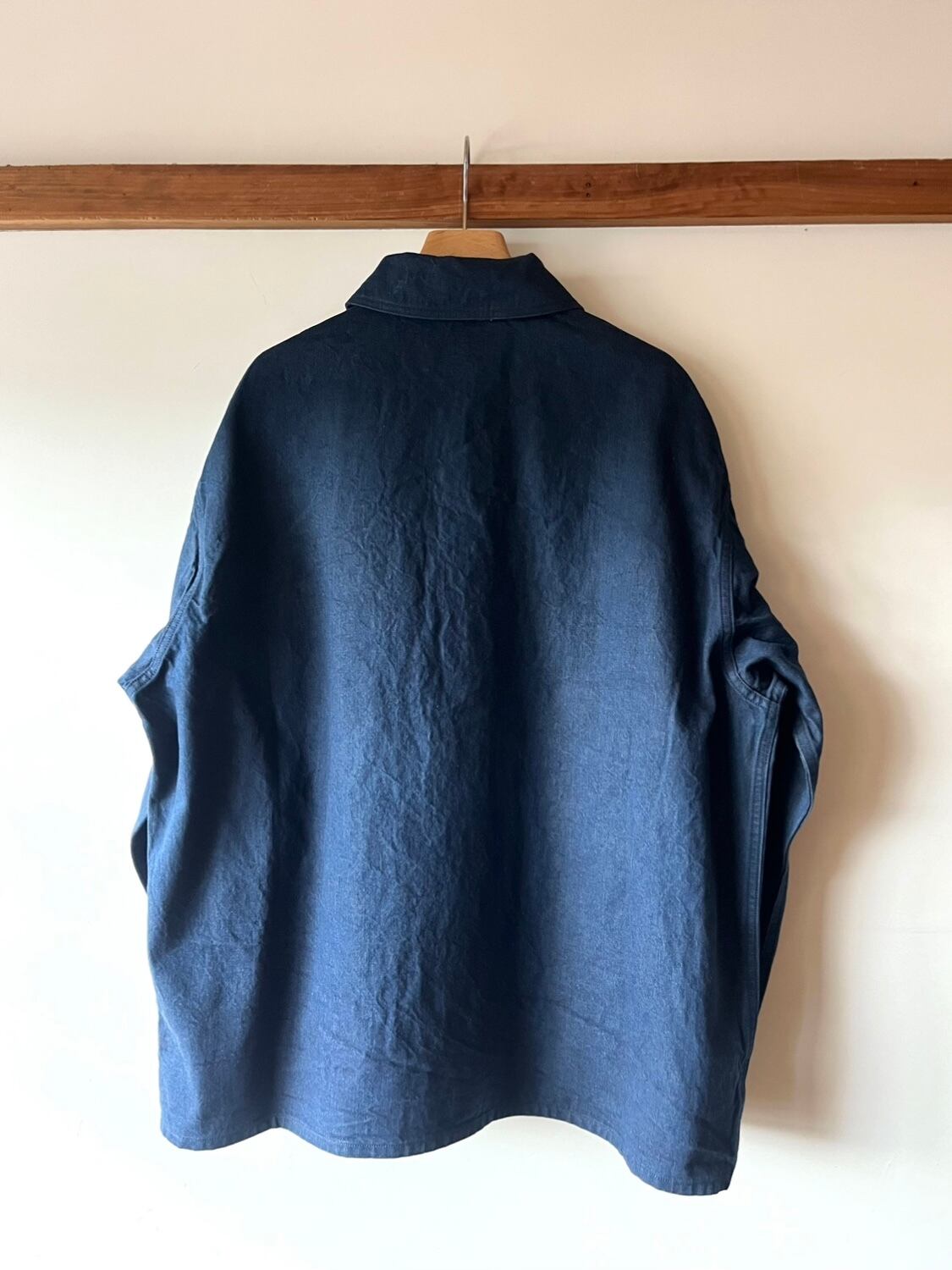 経年変化が楽しめる深みのあるインディゴ。フロントの大きなポケットが特徴的で、収納力を確保しながら、デザインのアクセントにも。