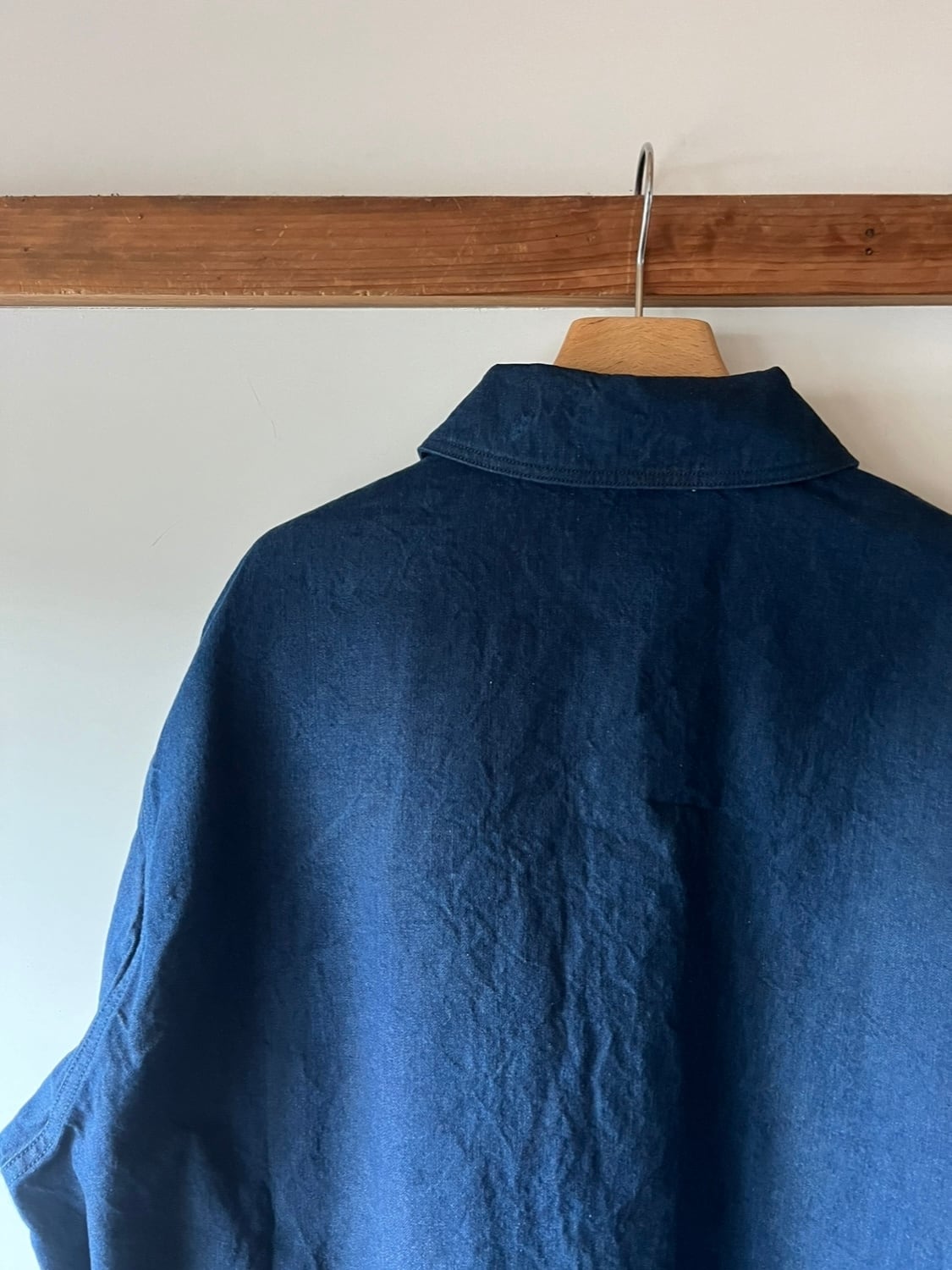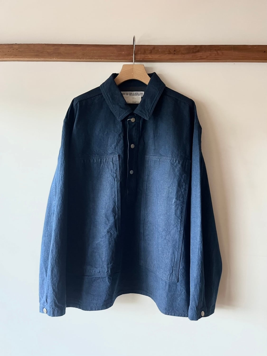 ゆったりしたサイズ感と、フロントの大きなポケットが特徴のプルオーバーデニムシャツ。
