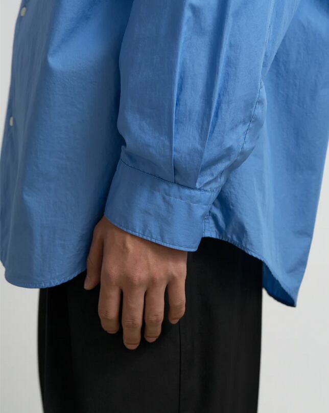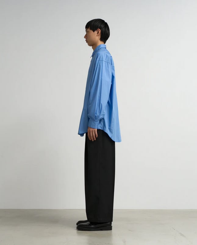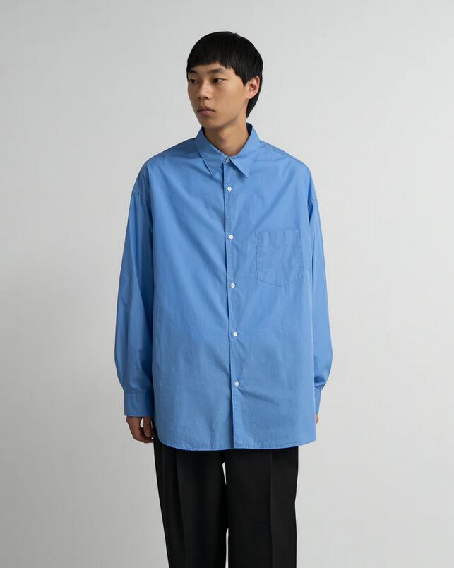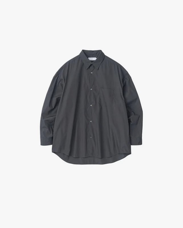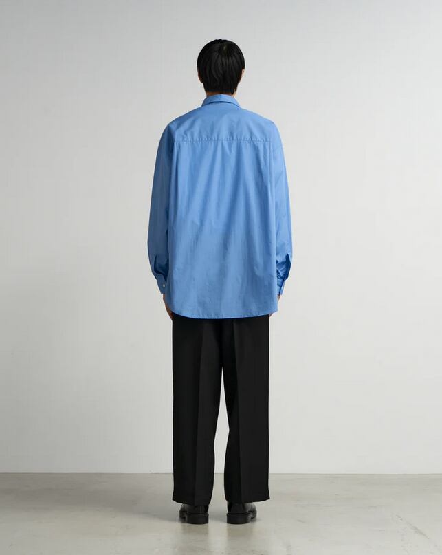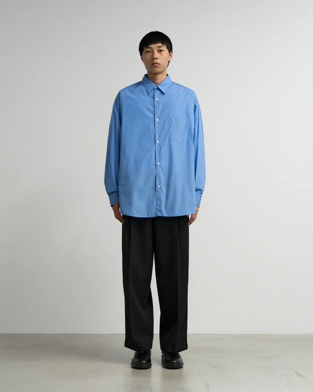 オーセンティックなレギュラーカラーのロングスリーブシャツ。肩の傾斜や低く下げられたヨークの位置、アームホールの広さなど、細かなディテールを特異なバランスで仕上げたドロップショルダーでボリュームのあるボックスシルエットが特徴。なめらかに整った繊維そのものの光沢感と、均一な撚りにより毛羽立ちにくい超長綿であるスーピマコットン、非常に繊細な糸番手で製織したブロード生地を使用。高級シーツにも使用されている生地で適度なハリと柔らかさがあり着心地が非常に良い。