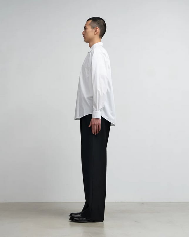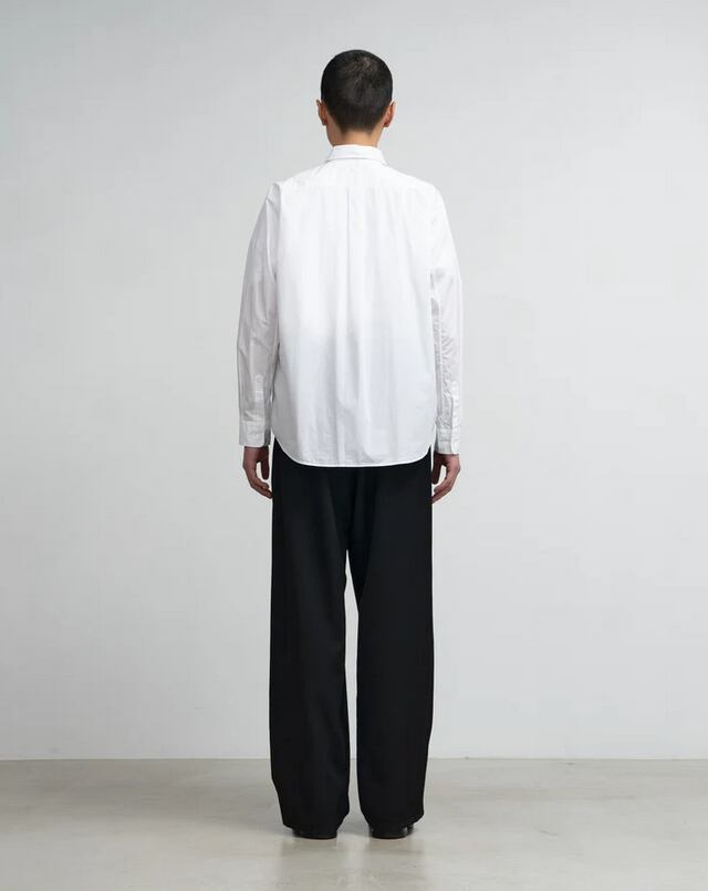 オーセンティックなボックスシルエットのレギュラーカラーシャツ。なめらかに整った繊維そのものの光沢感と、均一な撚りにより毛羽立ちにくい超長綿であるスーピマコットンを、非常に繊細な糸番手で製織したブロード生地を使用。高級シーツにも使用されている生地で適度なハリと柔らかさがあり着心地が非常に良いのが特徴です。※3サイズ展開で体型に合わせたサイズ感を楽しめます。