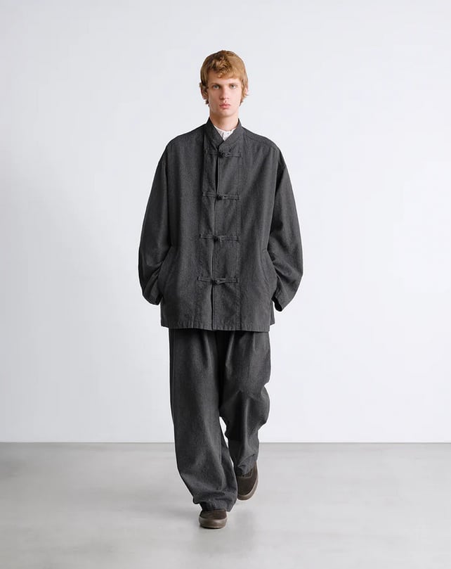 硫化染めの黒糸と白糸を撚り合わせて織り上げたメランジギャバジンを使用したイージーパンツ。単色では表現できない霜降り状の豊かな色合いと奥行きある表情が魅力。腰回りに施した2本のタックから裾に向かって美しいテーパードラインを描き、洗い加工により程よいフェード感とパッカリングをプラスした、程よく力の抜けた表情の一着です。