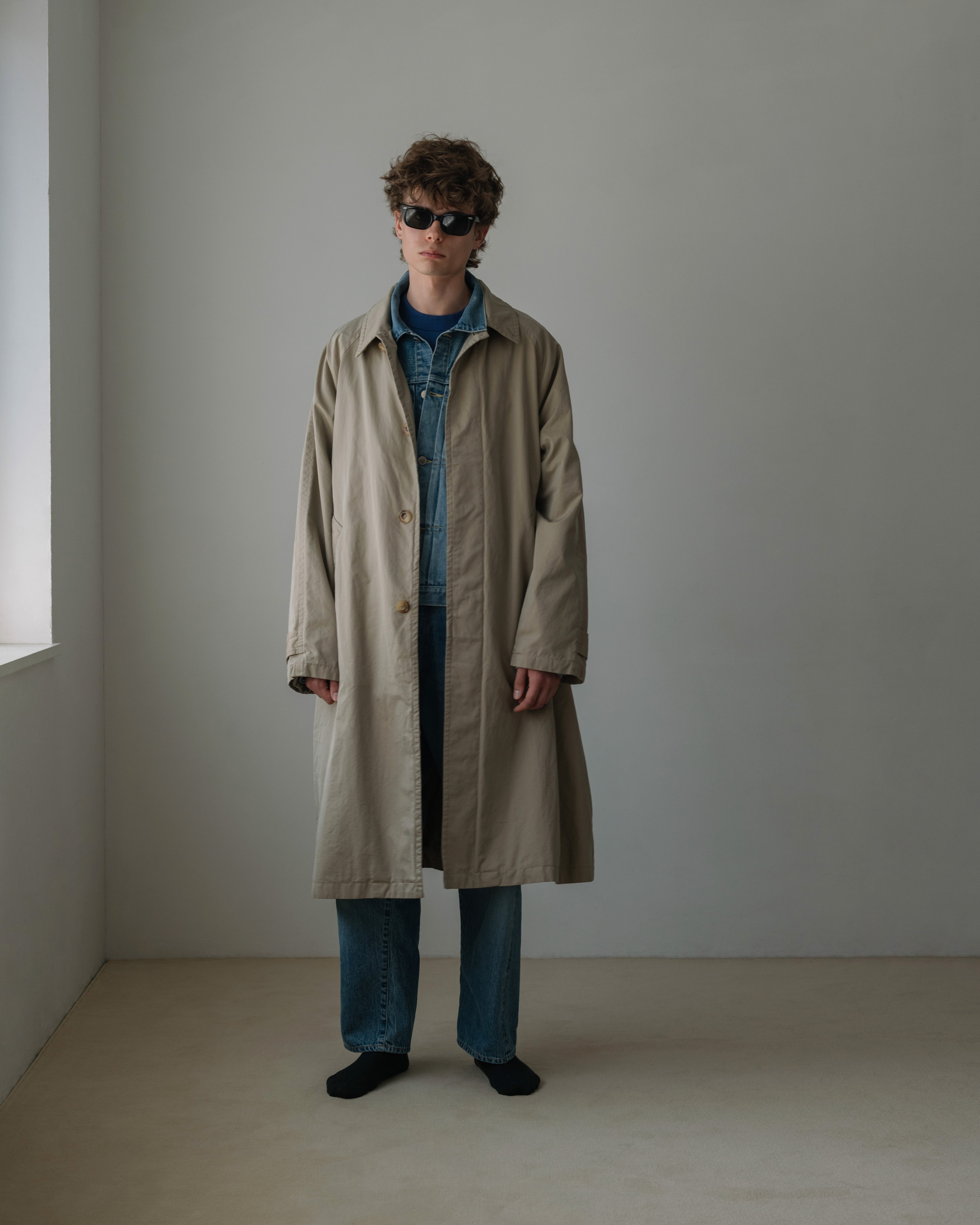当時、様々なロットの糸が混在して使用されていたであろうことを想定し、複雑な表情を再現しました。 青味のあるピュアインディゴ(合成インディゴ100%)を使用。 児島の染工場の特許技術による特殊加工で、染め上がったインディゴの色目を、長年倉庫に眠っていたかのような深みのあるデッドス トックブルーへと熟成させています。