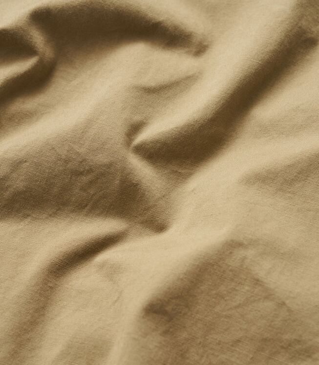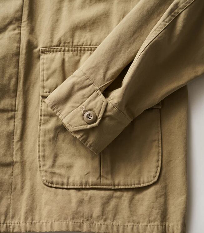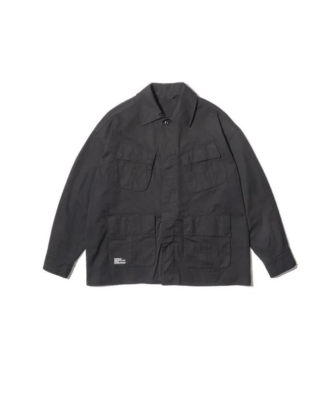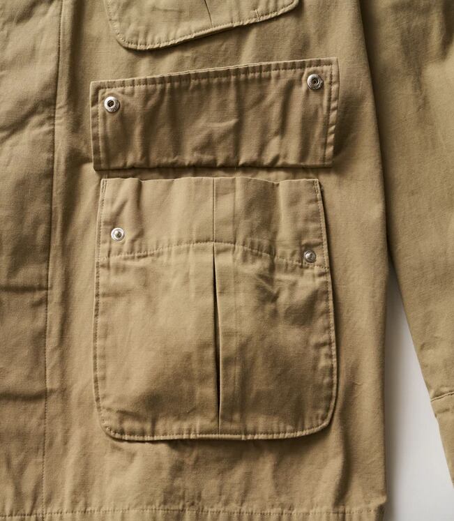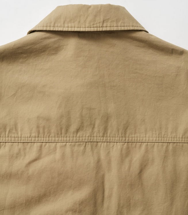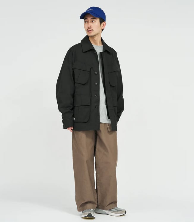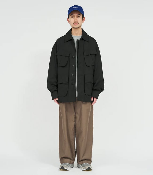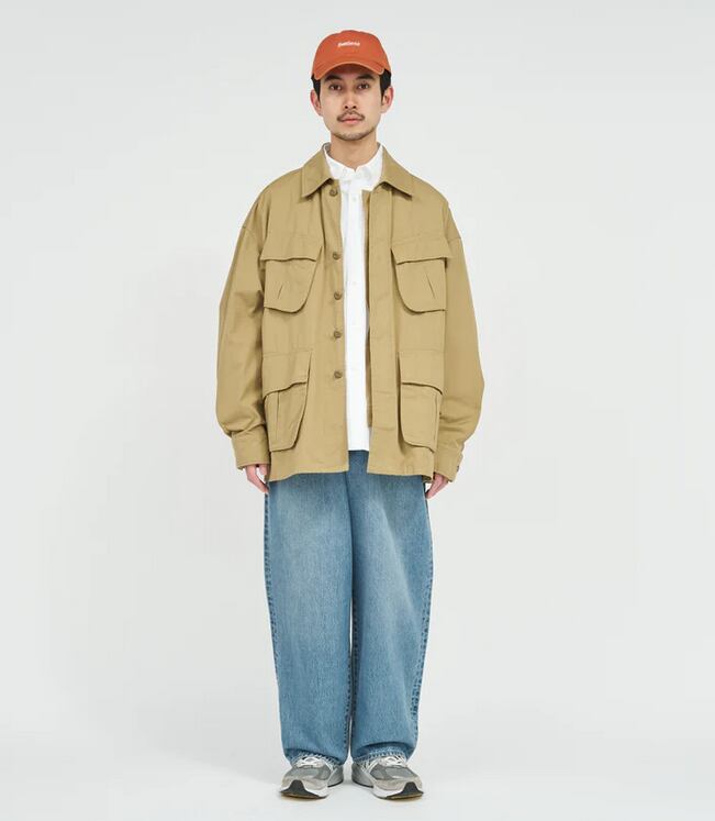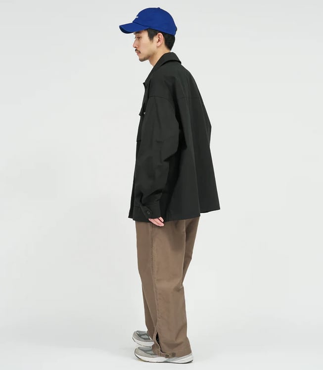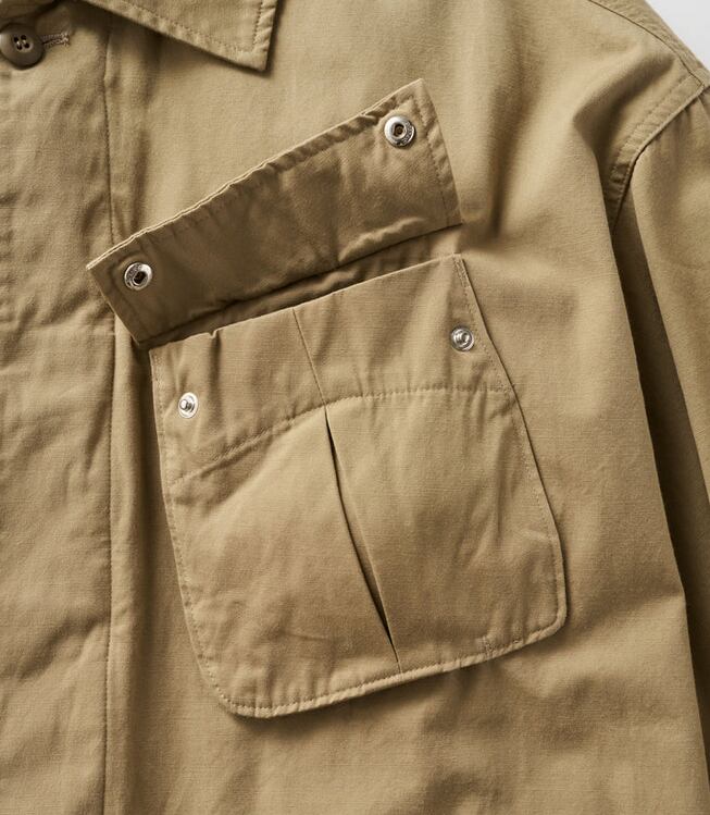 無骨なミリタリーファブリックには、長年着込んだようなフェード加工を施し、奥行きのある豊かな表情に。同素材の“COMBAT TROPICAL TROUSERS”とのセットアップはもちろん、単体でも羽織るだけでスタイリングが成立する存在感のある一着です。