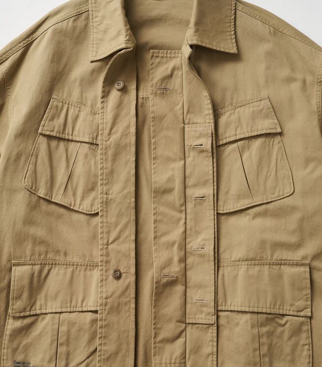 往年のU.S.ミリタリーのファティーグジャケットをデザインソースに、ドロップショルダーによるゆったりとしたボリュームシルエットに刷新。ミリタリーの機能美を残しつつ、FreshServiceらしいシルエットへとアップデートしました。