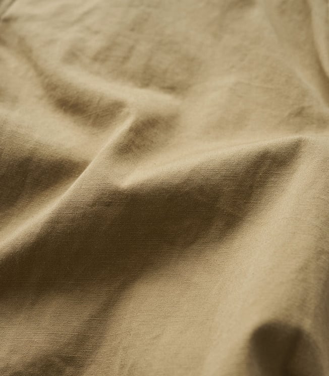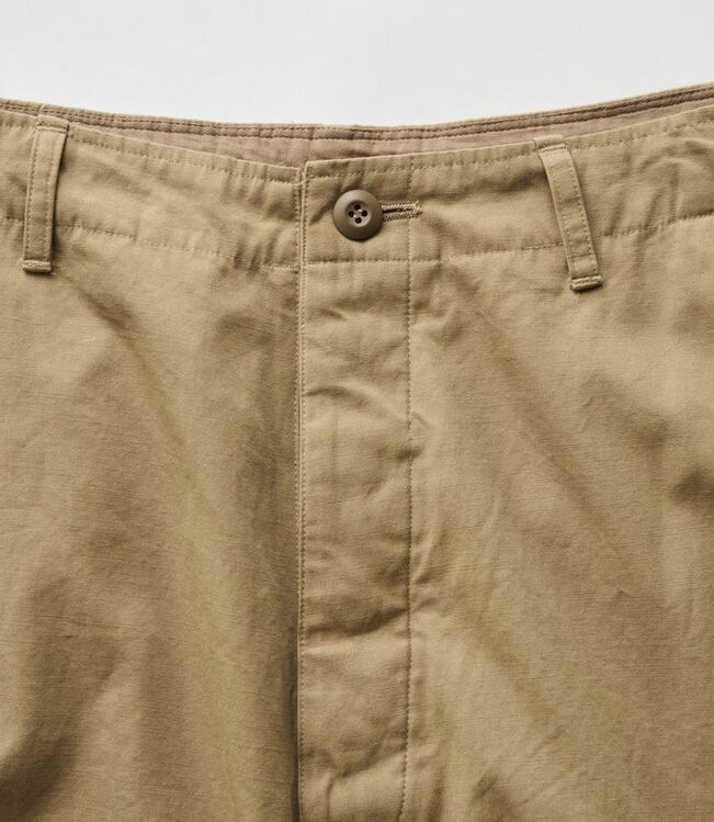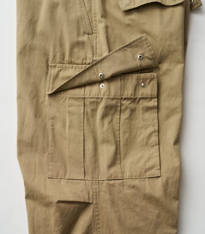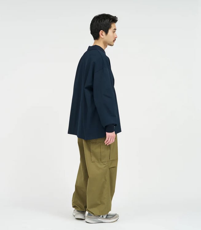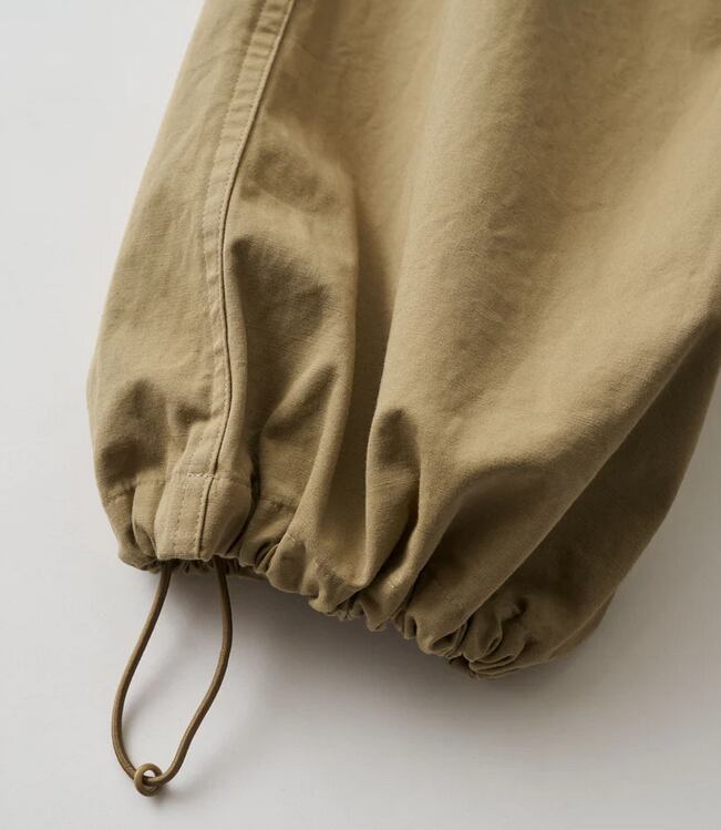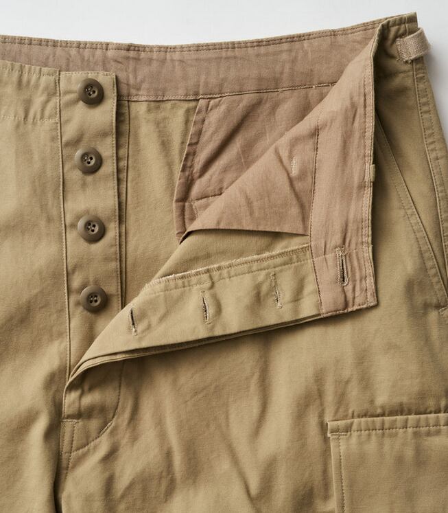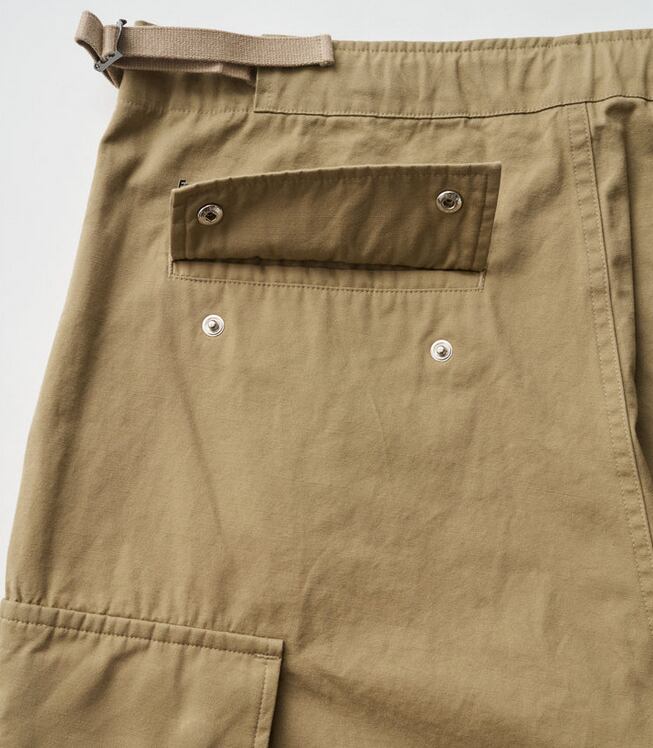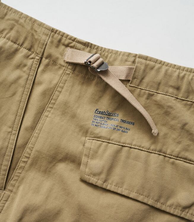 往年のU.S.ミリタリーのトロピカルトラウザーをデザインソースに、ヒップから裾にかけて極太のストレートシルエットへと刷新し、圧倒的なボリューム感を持たせFreshServiceらしいサイジングに再構築。ウエストのサイドアジャスターはゴムで連結することで伸縮性を高め、無骨なルックスとは対照的な快適な穿き心地を実現。裾にはドローコードを備え、絞ることでシルエットの変化も楽しめます。タフなミリタリーファブリックには、長年穿き込んだようなフェード加工を施し、深みのある表情に。同素材の"COMBAT TROPICAL JACKET”とのセットアップでの着用もおすすめです。
