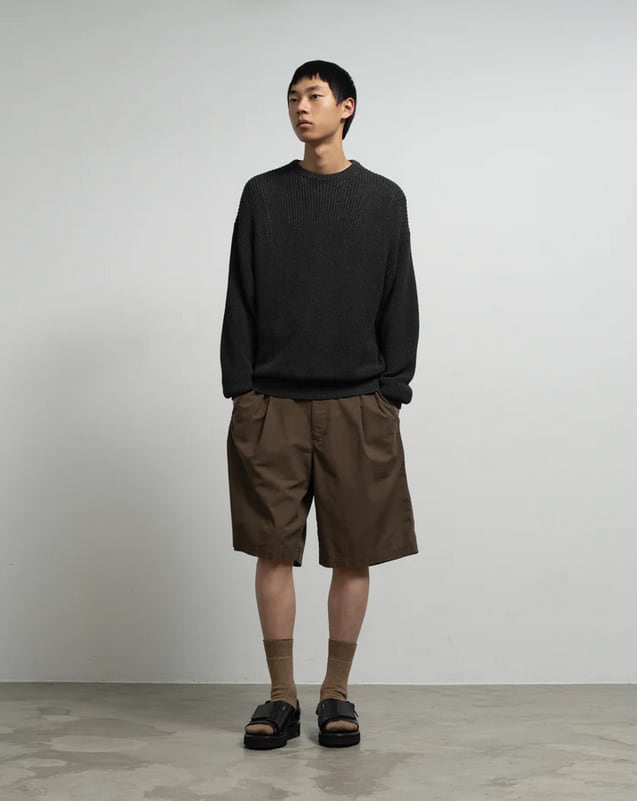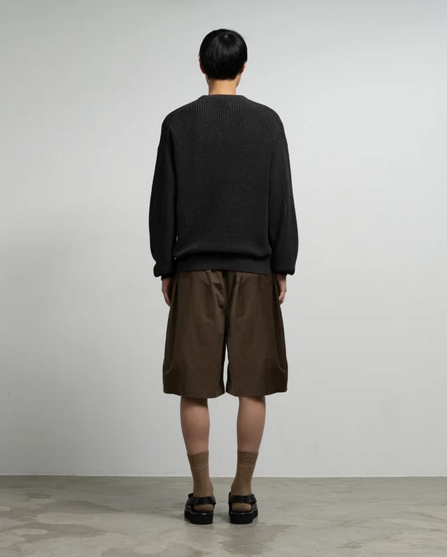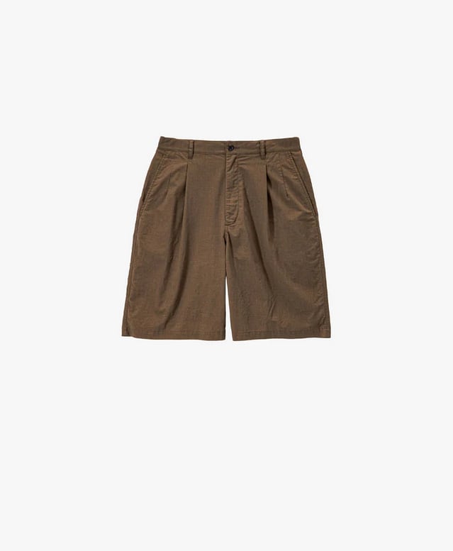 オーバーサイズスラックスをベースに裾幅と腰回りにゆとりを持たせた新シルエットのショートパンツ。綿とウールをブレンドしたポプリン素材を使用し、スーツ生地規格をシャツ専用設計に落とし込むことで薄手で通気性に優れ、混紡糸特有の奥行きある杢感がクラシックな印象を演出。製品洗いにより自然なパッカリングと柔らかな風合いを加え、履き心地と表情の両立を実現しています。