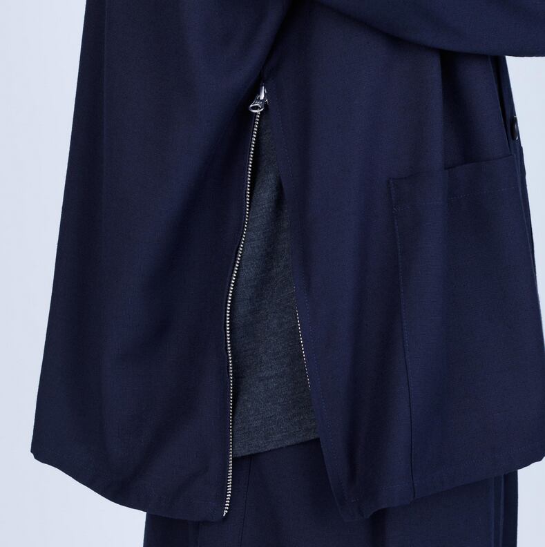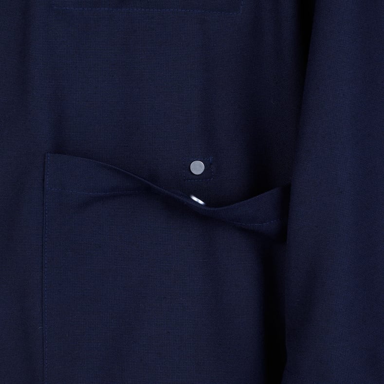 フロントのパッチポケットには比翼仕様のスナップボタンを採用し、前垂れを防ぐなど、細部まで丁寧に設計されています。