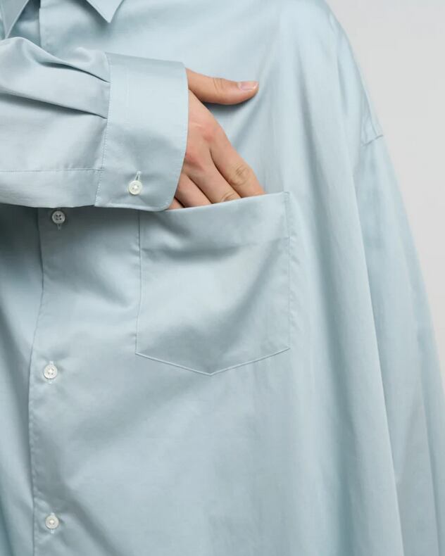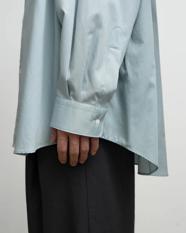 ドロップショルダーでボリュームのあるボックスシルエットのレギュラーカラーシャツ。肩の傾斜や低く下げられたヨークの位置、アームホールの広さなど、細かなディテールを特異なバランスで仕上げたビッグシルエットが特徴です。超長綿で織りあげた平織り生地にシリコンを原料にした特殊樹脂を含浸することで生地に反発感とハリ感を持たせ、さらにバイオ加工を合わせることで綿100%と思えないシルクのような滑らかで柔らかい風合いに仕上げています。