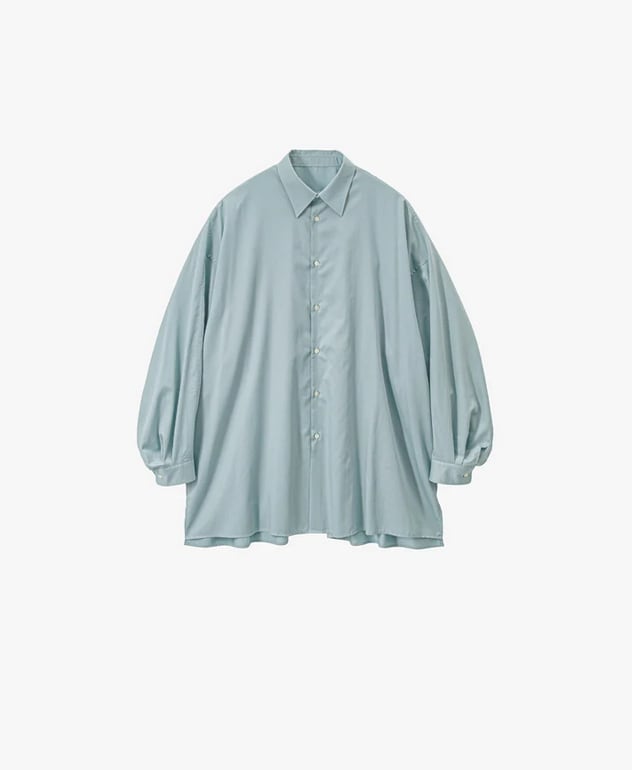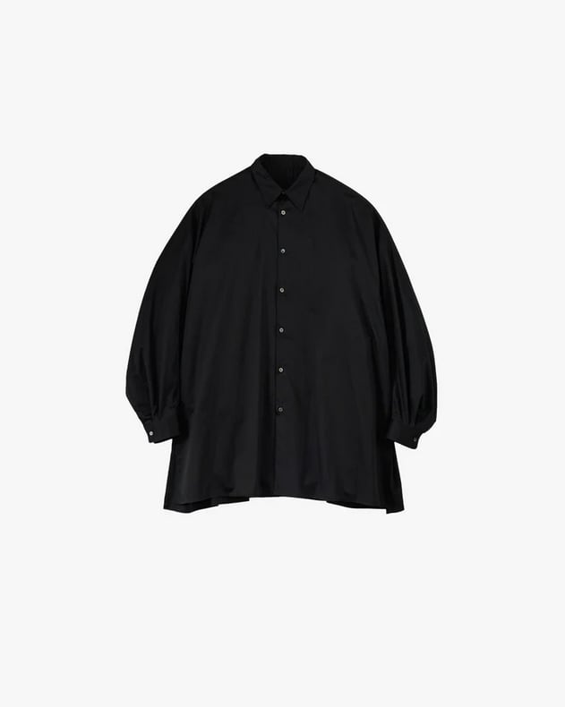 背中から一続きのヨークスリーブとボリュームのある袖がポイントのレギュラーカラーシャツ。深いサイドスリットが動くたびに揺れ、ドレープ感が美しい一枚。シリコンを原料にした特殊樹脂を含浸させた超長綿の平織り素材は、シルクのような滑らかな質感で着心地も抜群です。同素材のパンツと合わせてセットアップのスタイリングも楽しめます。