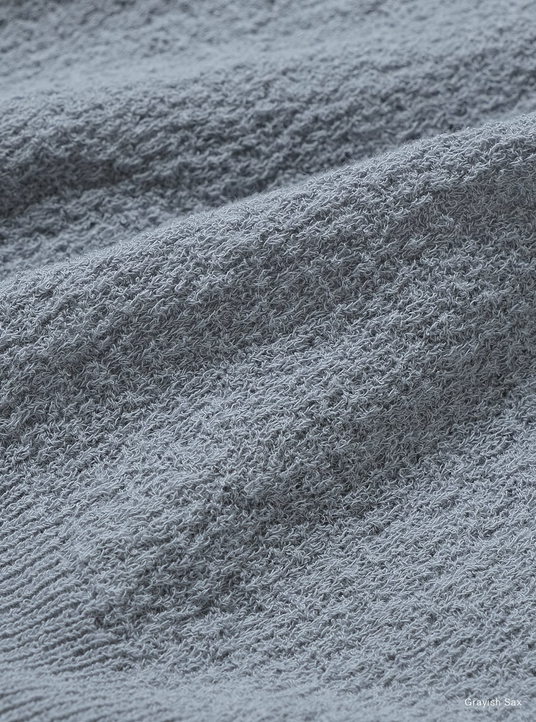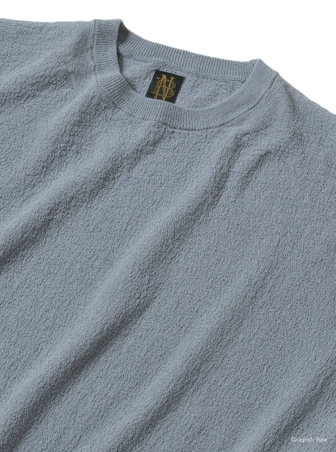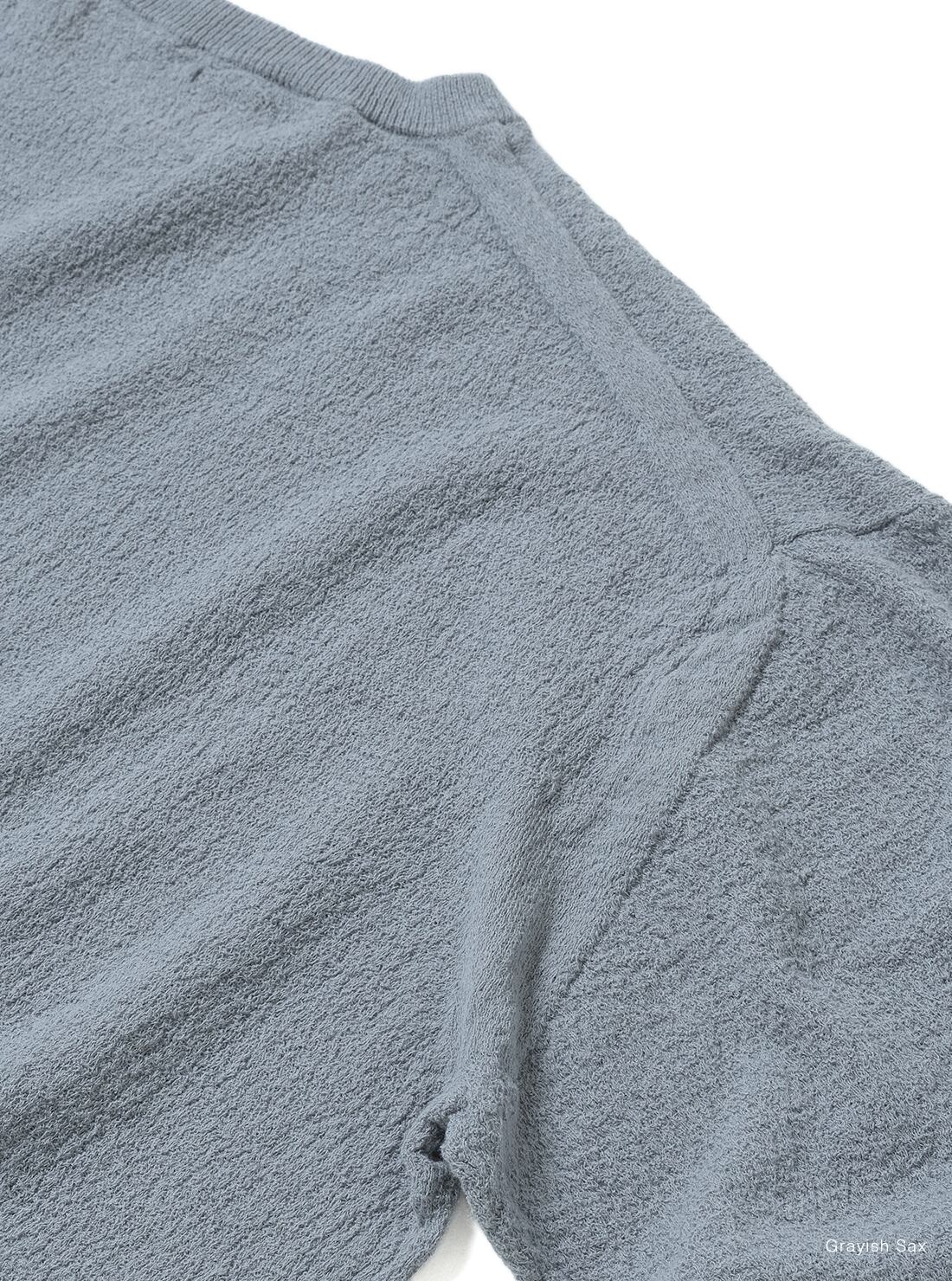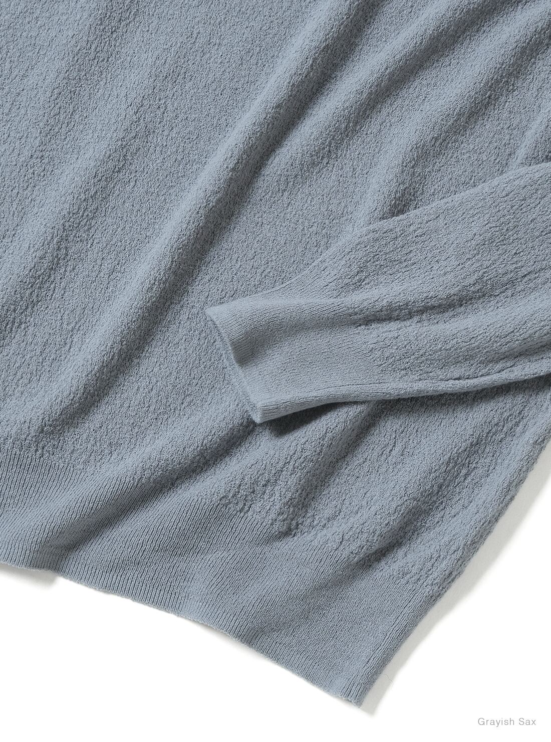 スヴィンコットンを特殊紡績で強撚に仕立て、さらに撚糸を加えることで、布帛の楊柳生地のような独特の表情を表現した商品。凸凹構造により肌との接触面積を抑え、ドライな風合いと程よい伸縮性をあわせ持つ仕上がりです。肩幅にゆとりのあるデザイン。