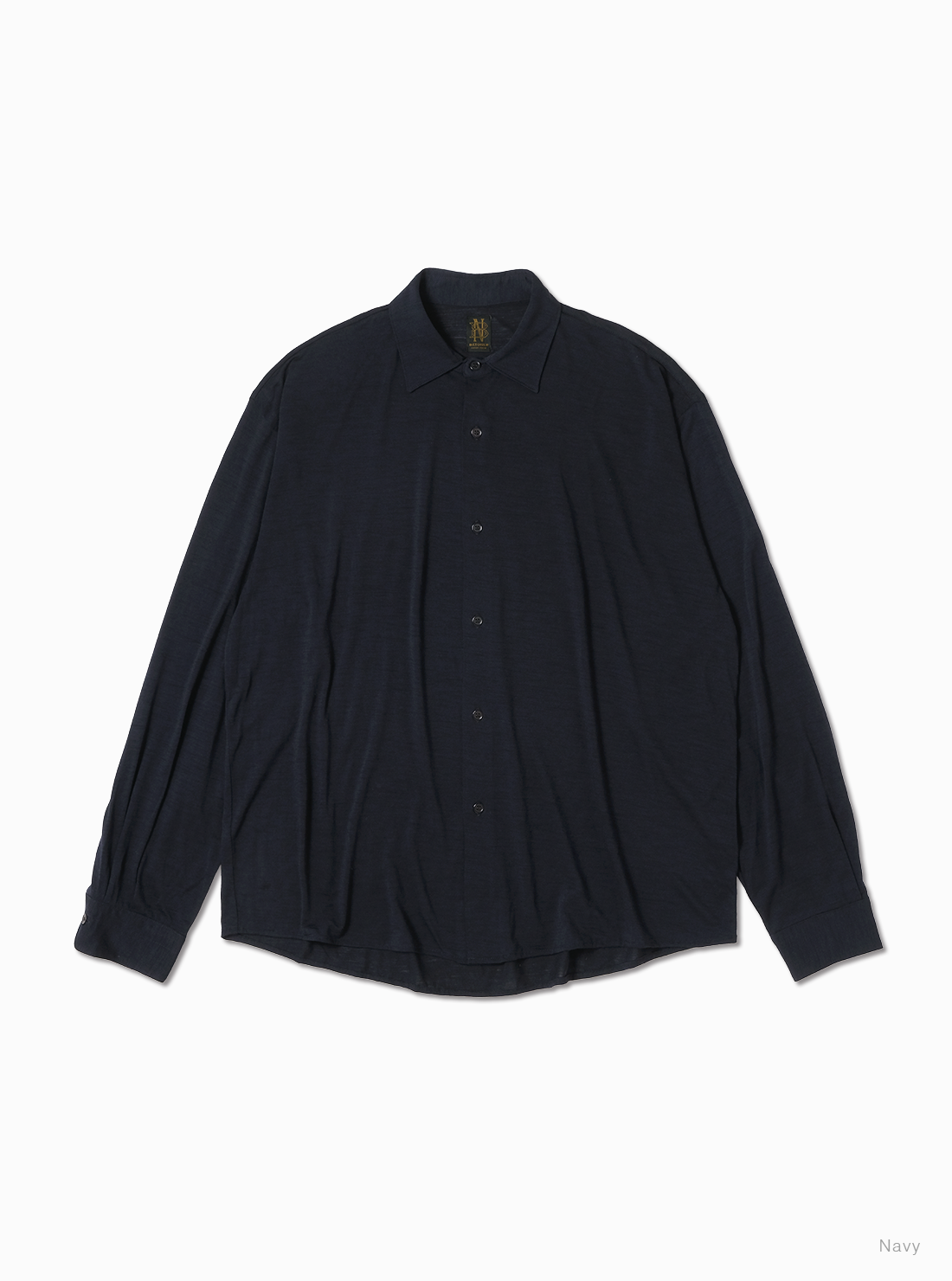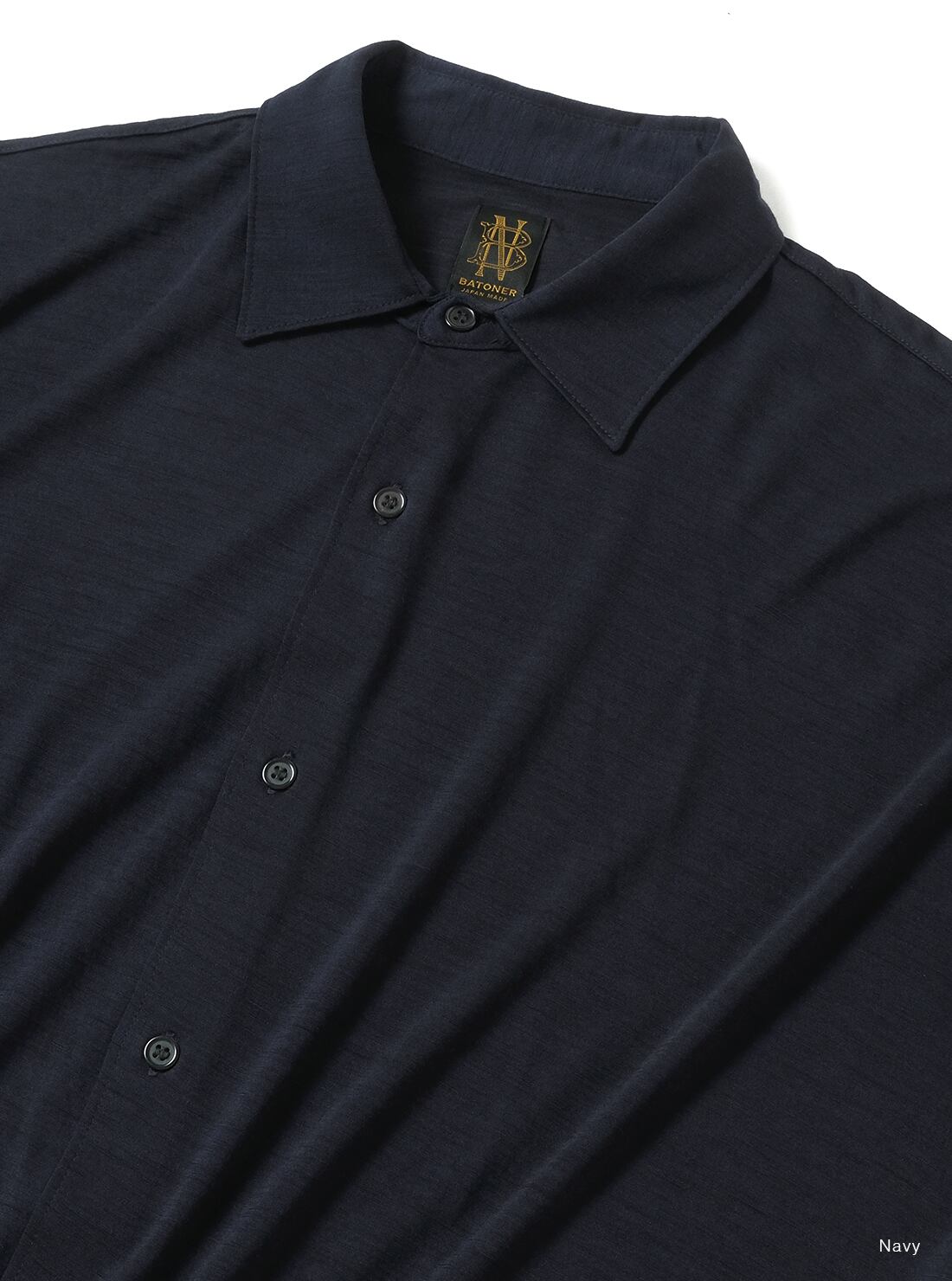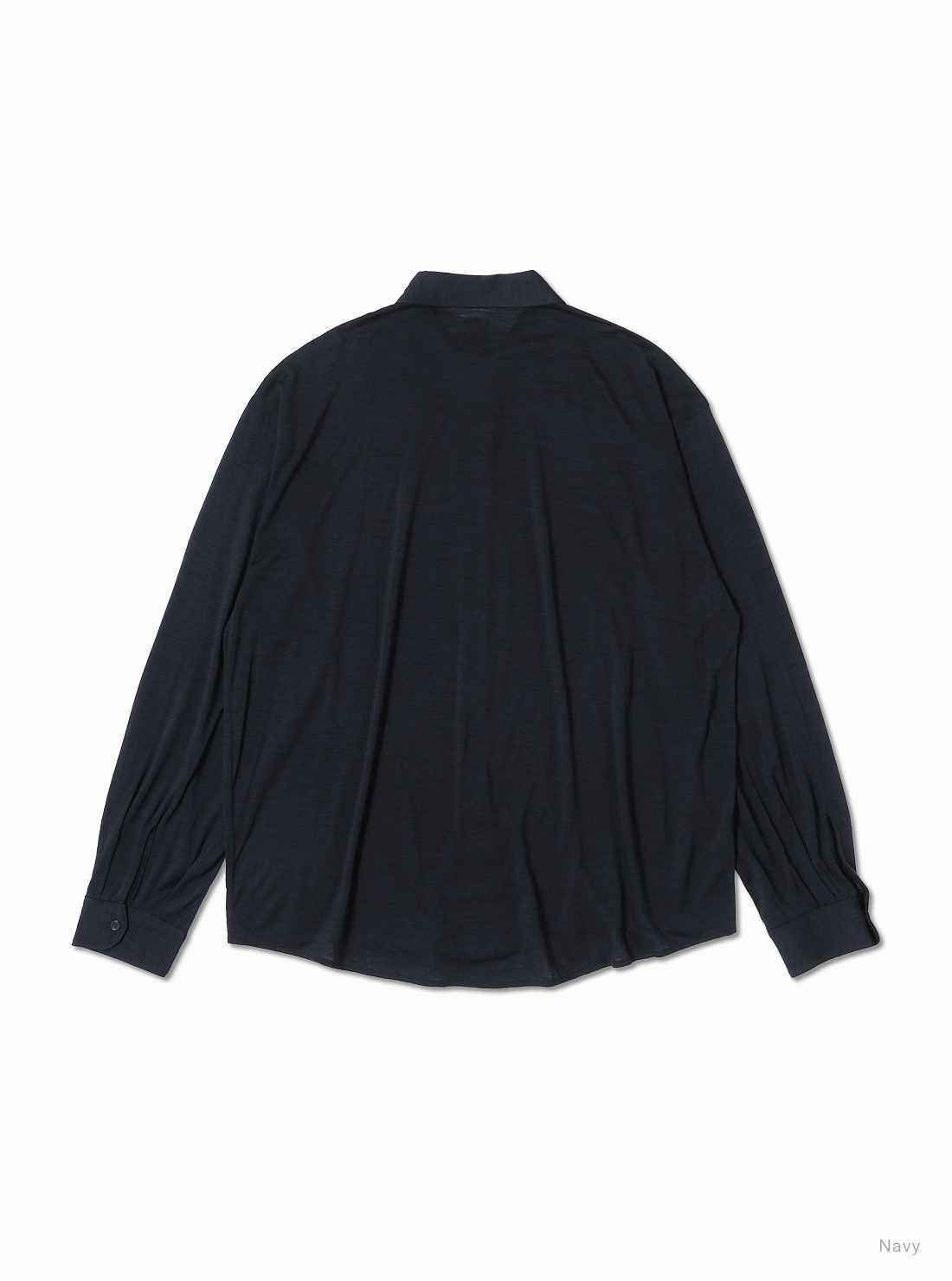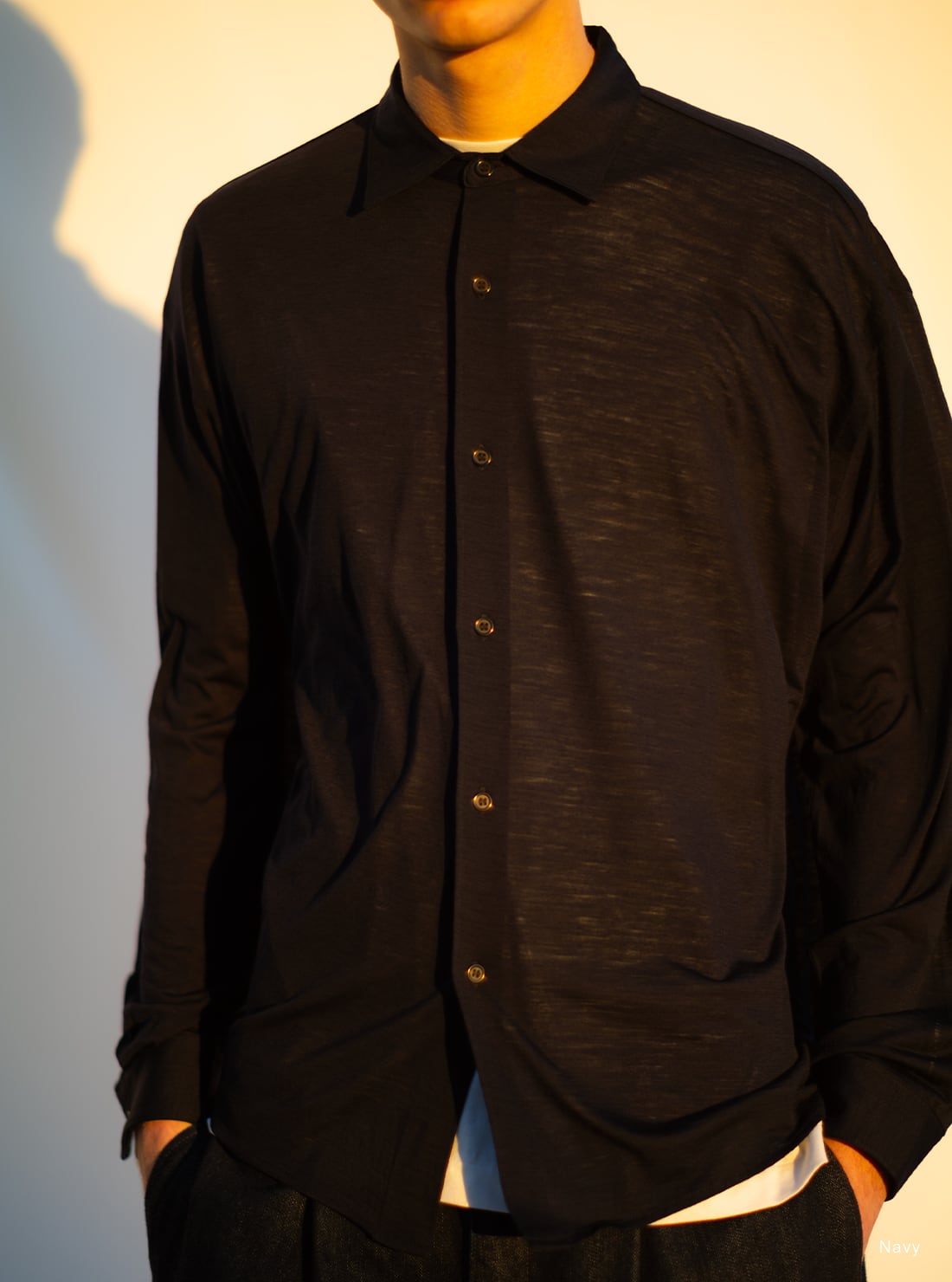 極細番手のメリノウール糸を使用し、超ハイゲージ編機で丁寧に編み立てたメリヤスシャツ。軽く薄い生地は柔らかく、透け感のあるシアーな風合いと、ウールならではの伸縮性が特徴です。袖丈が長めのデザイン。