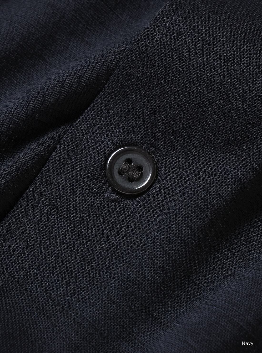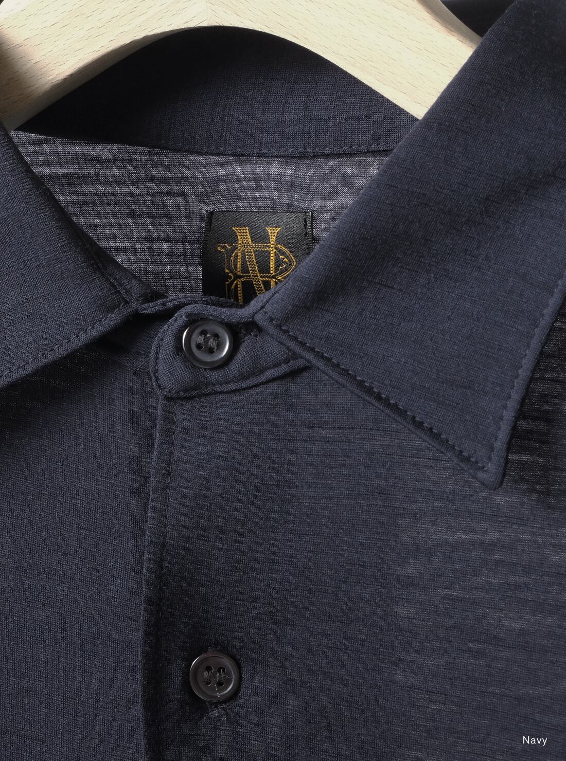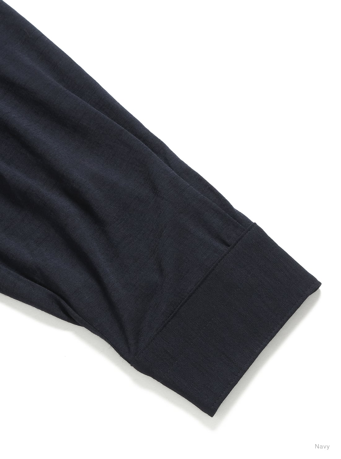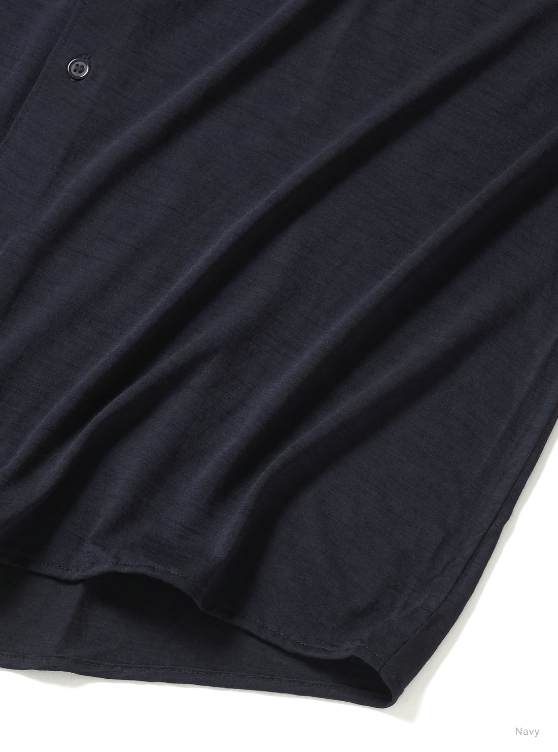 極細番手のメリノウール糸を使用し、超ハイゲージ編機で丁寧に編み立てたメリヤスシャツ。軽く薄い生地は柔らかく、透け感のあるシアーな風合いと、ウールならではの伸縮性が特徴です。袖丈が長めのデザイン。