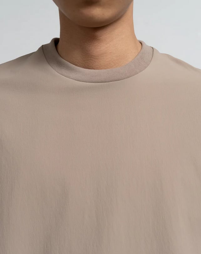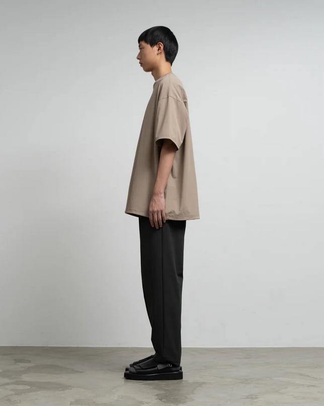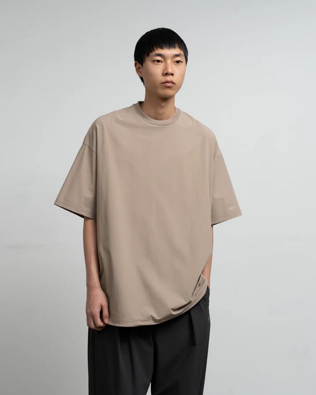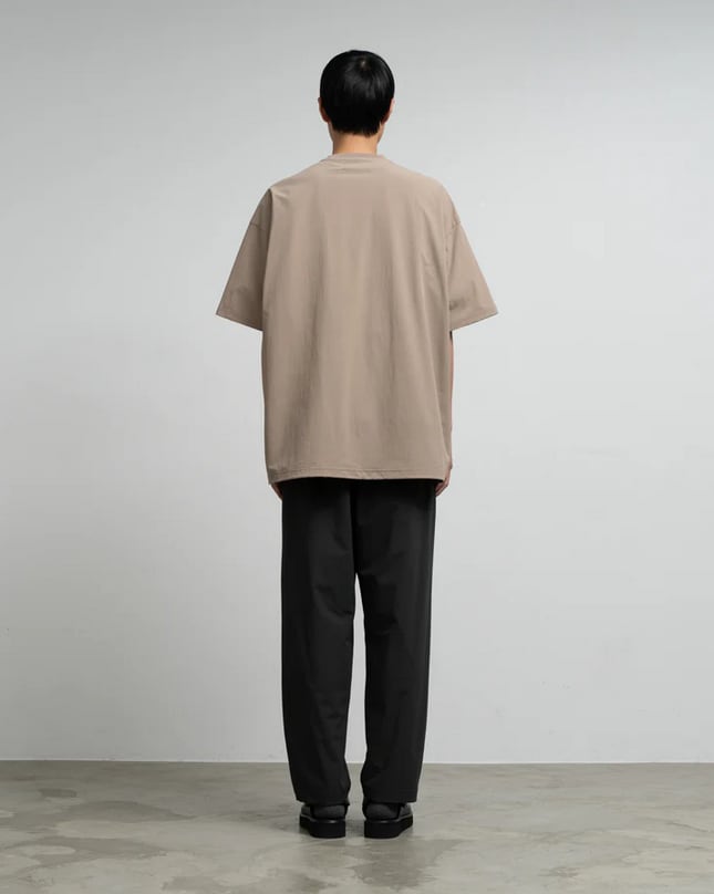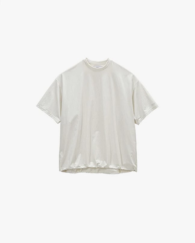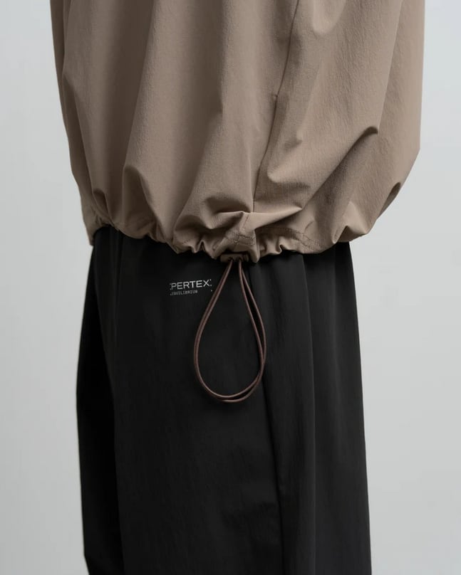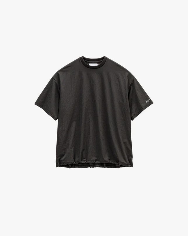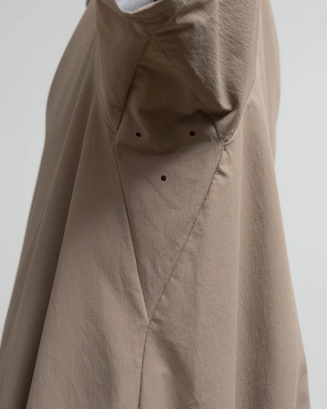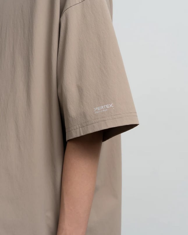 ナイロン素材の中でも軽量かつ高い耐久性を誇り、さらに優れた速乾性・透湿性により衣類内環境を快適に保つPERTEX® Equilibriumを採用したショートスリーブのプルオーバー。脇下にはレーザーカットによるベンチレーションホールを備えたガゼットを配し、通気性と動きやすさを高めています。ゆとりのあるフォルムに、裾のドローコードでシルエットの変化を楽しめる一着です。
